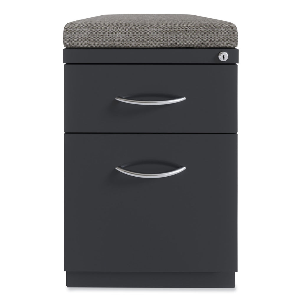 Mobile pedestal files at 20 deep with a two-drawer box-file drawer configuration and included seat cushion are designed to support the demand of today's office. Durable, fully assembled steel construction with non-porous surface is easy to clean. These commercial grade mobile pedestals come standard with factory installed hidden casters, full extension drawers, counterweights, drawer divider, pencil tray and a core-removable lock for security. The file drawer accommodates letter-size hanging files. The ball-bearing suspension ensures a smooth and quiet drawer performance. Extended fronts with satin nickel arch pull handles provide a sleek and contemporary design. The 21.75 height allows these units to roll under most work surfaces.