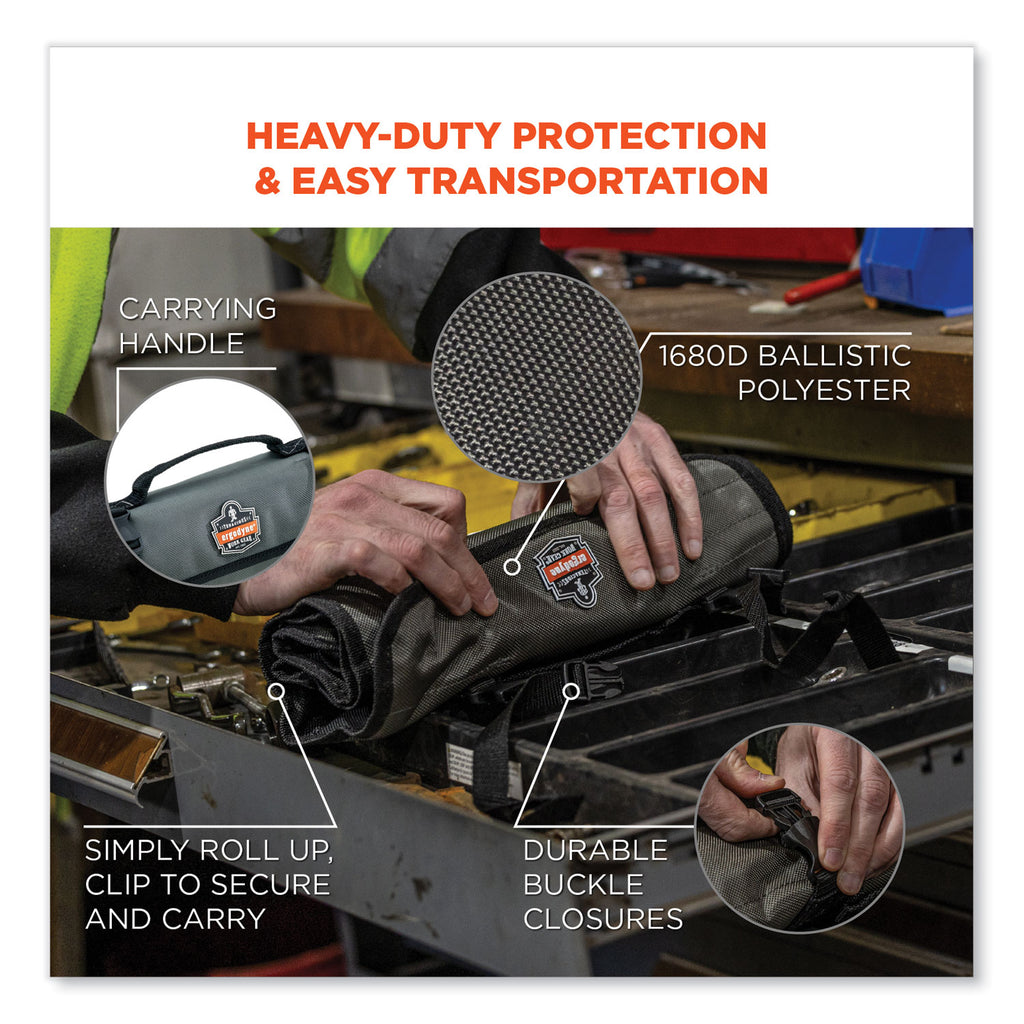 This tool organizer roll up features 25 tool pockets for convenient transport, easy organization and durable protection of hand tools. The inside of the tool roll features 22 various sized open-top slots for storing screwdrivers, wrenches, pliers and more. For safe storage of fasteners and other small hardware, it also features three topped accessory pockets with hook-and-loop closures. Made with heavy-duty 1680D ballistic polyester to protect tools through the everyday grind. This space-saving tool organizer rolls up and securely buckles shut to stow neatly in trucks, buckets, work benches and more. Adjustable cinch straps tighten to prevent tools from spilling out, while a durable carrying handle makes it easy to transport from site to site. This tool roll up is ideal for workers needing a compact solution for storing, organizing and transporting hand tools, including construction, carpentry, automotive, electrical and more.