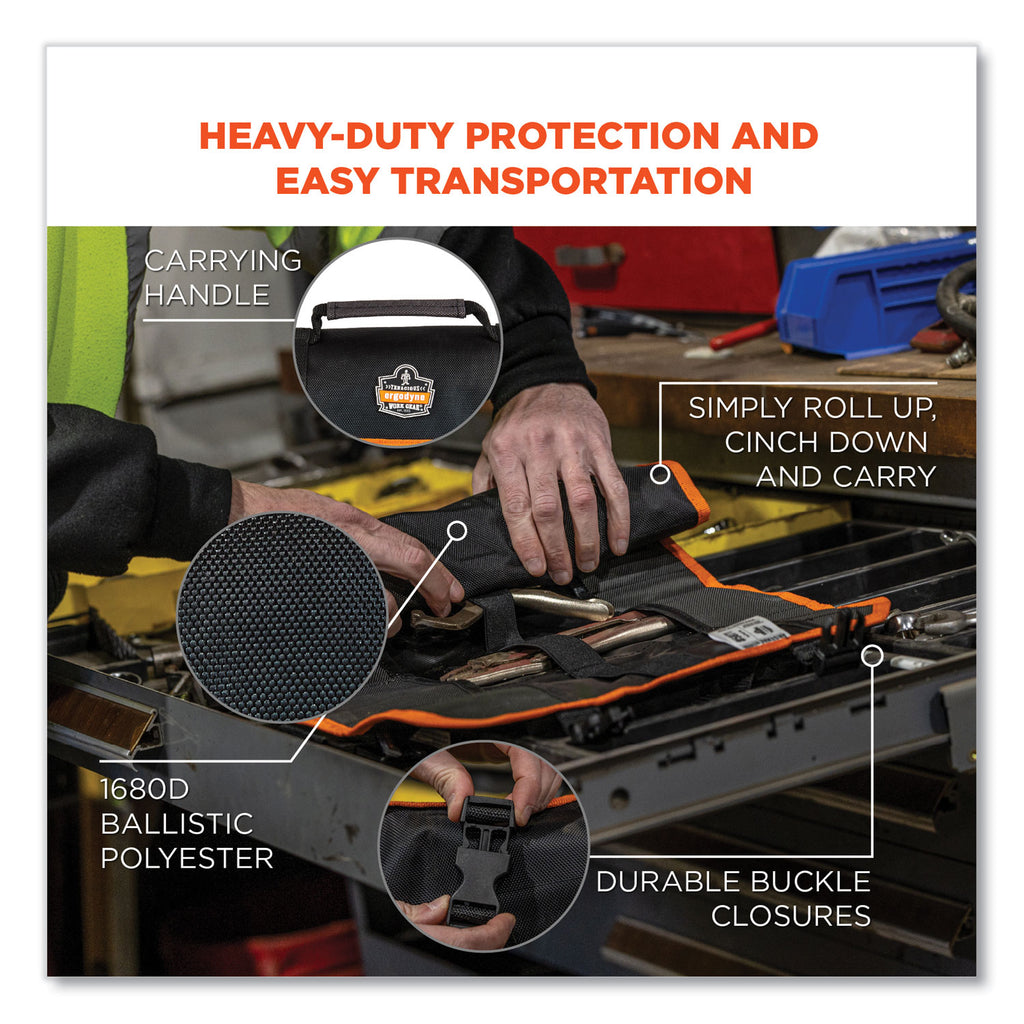 This tool organizer roll up features 21 tool pockets for convenient transport, easy organization and durable protection of hand tools. The inside of the tool roll features 19 various sized open-top slots with elastic webbing across the middle to secure screwdrivers, wrenches, pliers and more. For safe storage of fasteners and other small hardware, it also has one interior and one exterior tarpaulin pocket with YKK zippers. Made with heavy-duty 1680D ballistic polyester and water-repellant finish to protect tools through the everyday grind. This space-saving tool organizer rolls up and securely buckles shut to stow neatly in trucks, buckets, work benches and more. Adjustable cinch straps tighten to prevent tools from spilling out, while a durable carrying handle makes it easy to transport from site to site. This tool roll up is ideal for workers needing a compact solution for storing, organizing and transporting hand tools, including construction and carpentry.