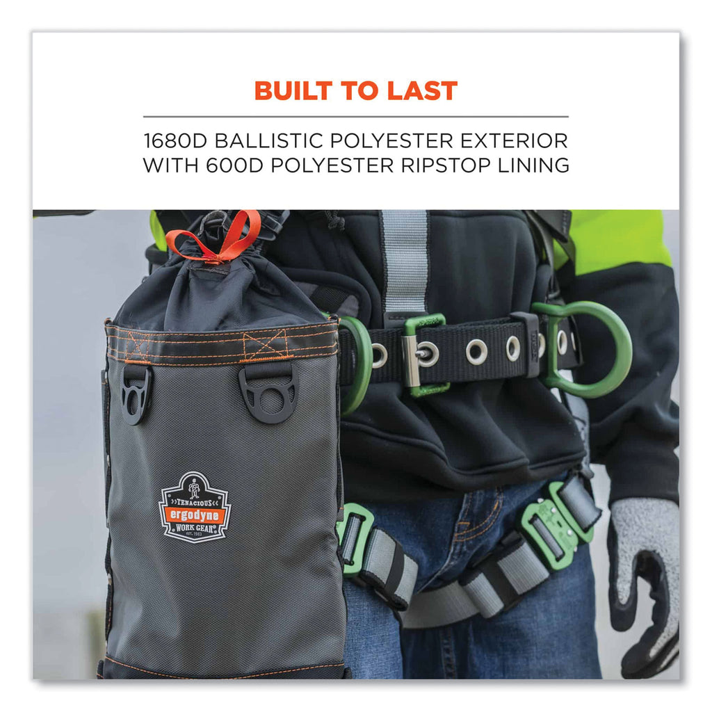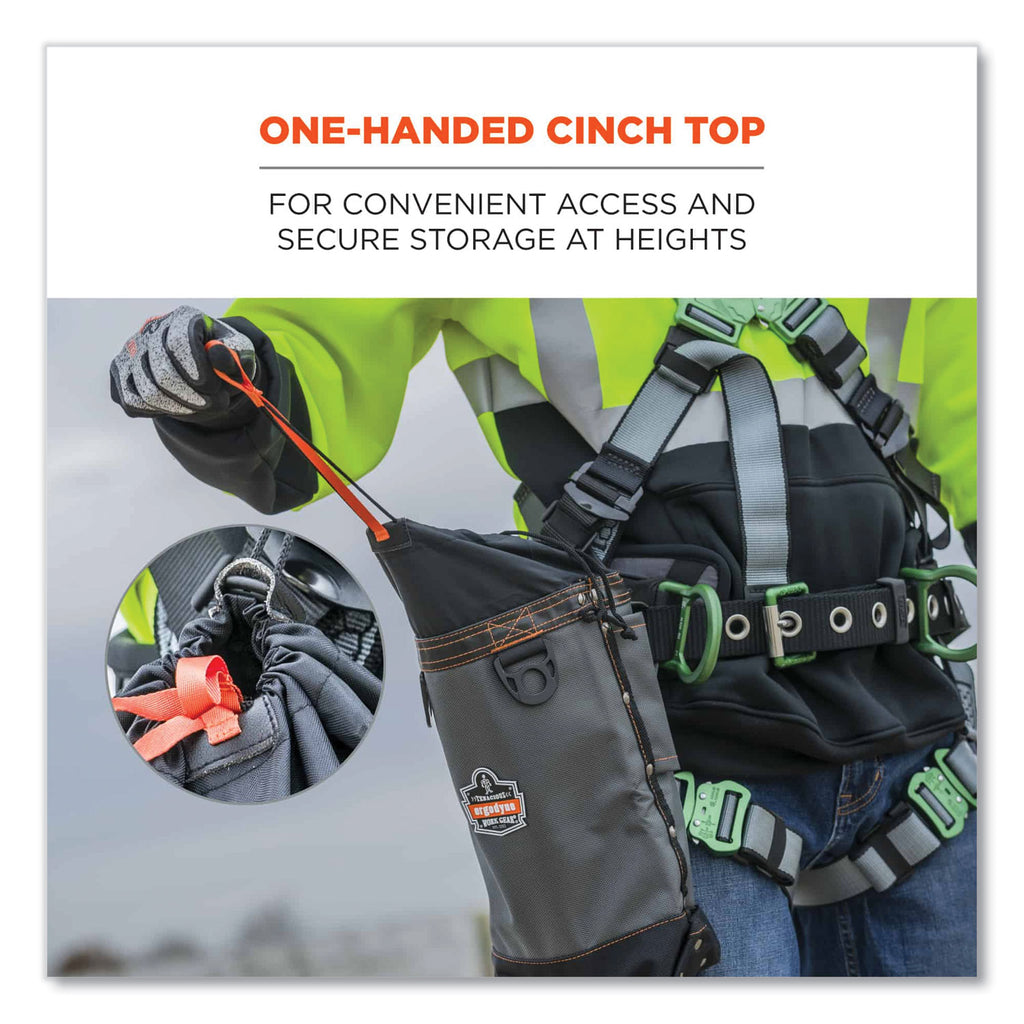 - One-handed cinch top with drawstring closure for convenient access and secure storage of tools while at heights.