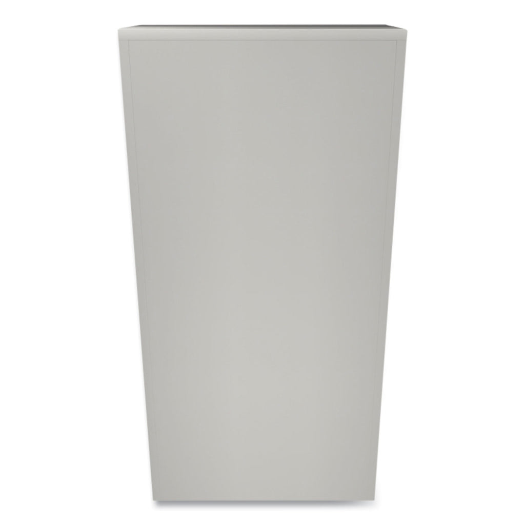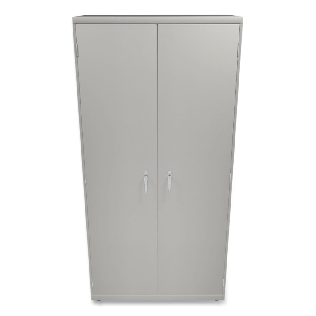 Industrial grade steel with one locking and one fixed, satin chrome double handles. HON "One Key" interchangeable lock core. Three-point locking system. Reinforced base with leveling glides. Tough construction provides extreme durability. Shelves adjust in 2" increments to accommodate different sized materials.