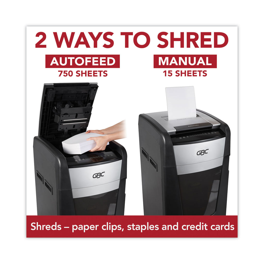 - Auto shreds documents, paper clips and staples, while credit cards must be manually inserted.