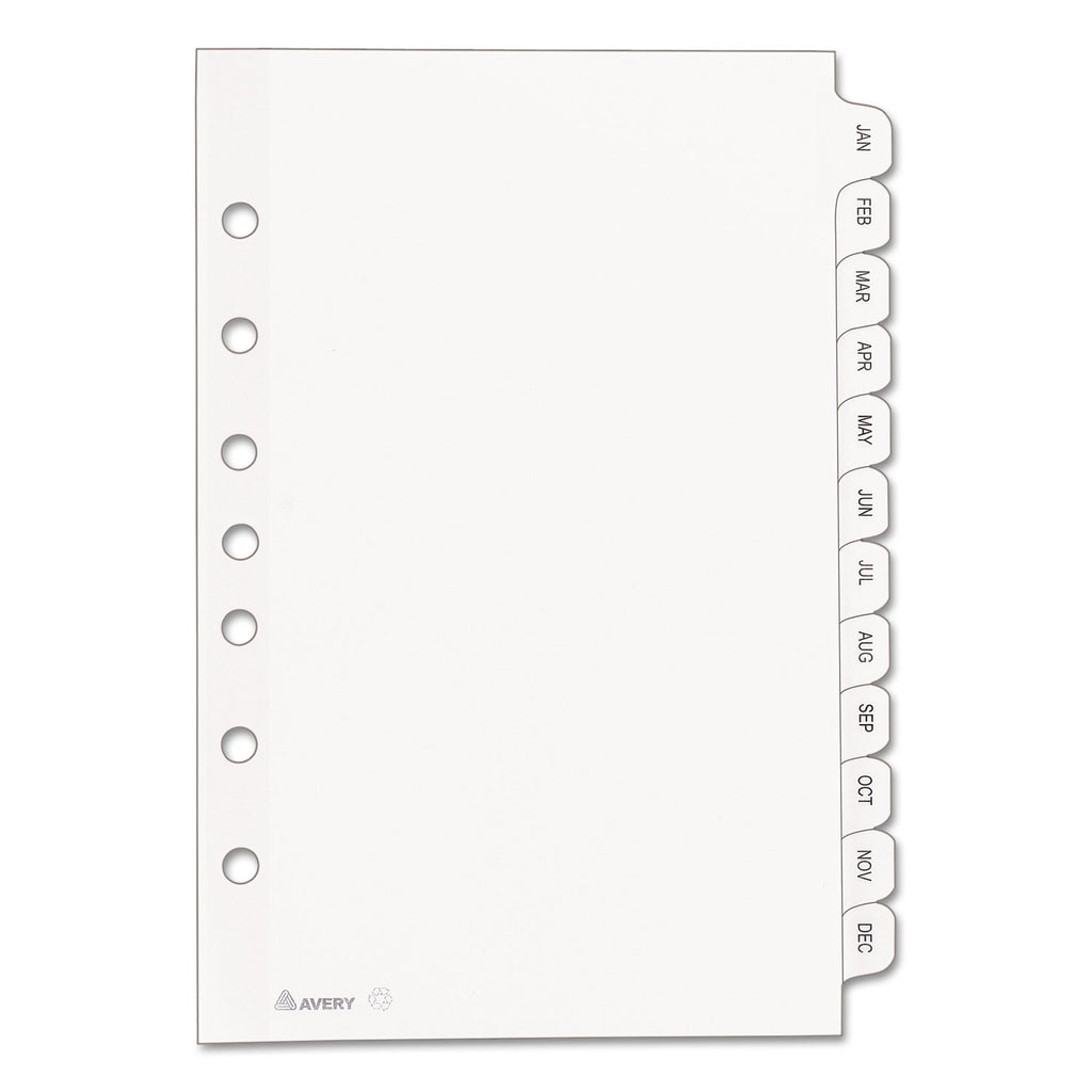 Dividers with preprinted tabs allow quick and easy organization of documents. Durable, white dividers with laminated tabs make page turning easy. 5.5" x 8.5" dividers are 7-hole punched for use with small format binders and organizers.