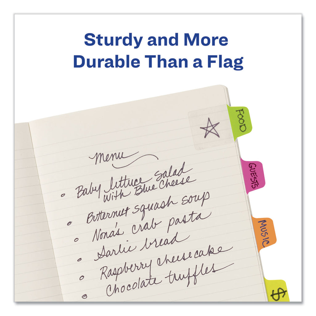 Durable, repositionable and reusable tabs are writable on both sides with a clear adhesive body so you can see text underneath. Tabs stick securely and remove cleanly with no residue. Write on tab and body.