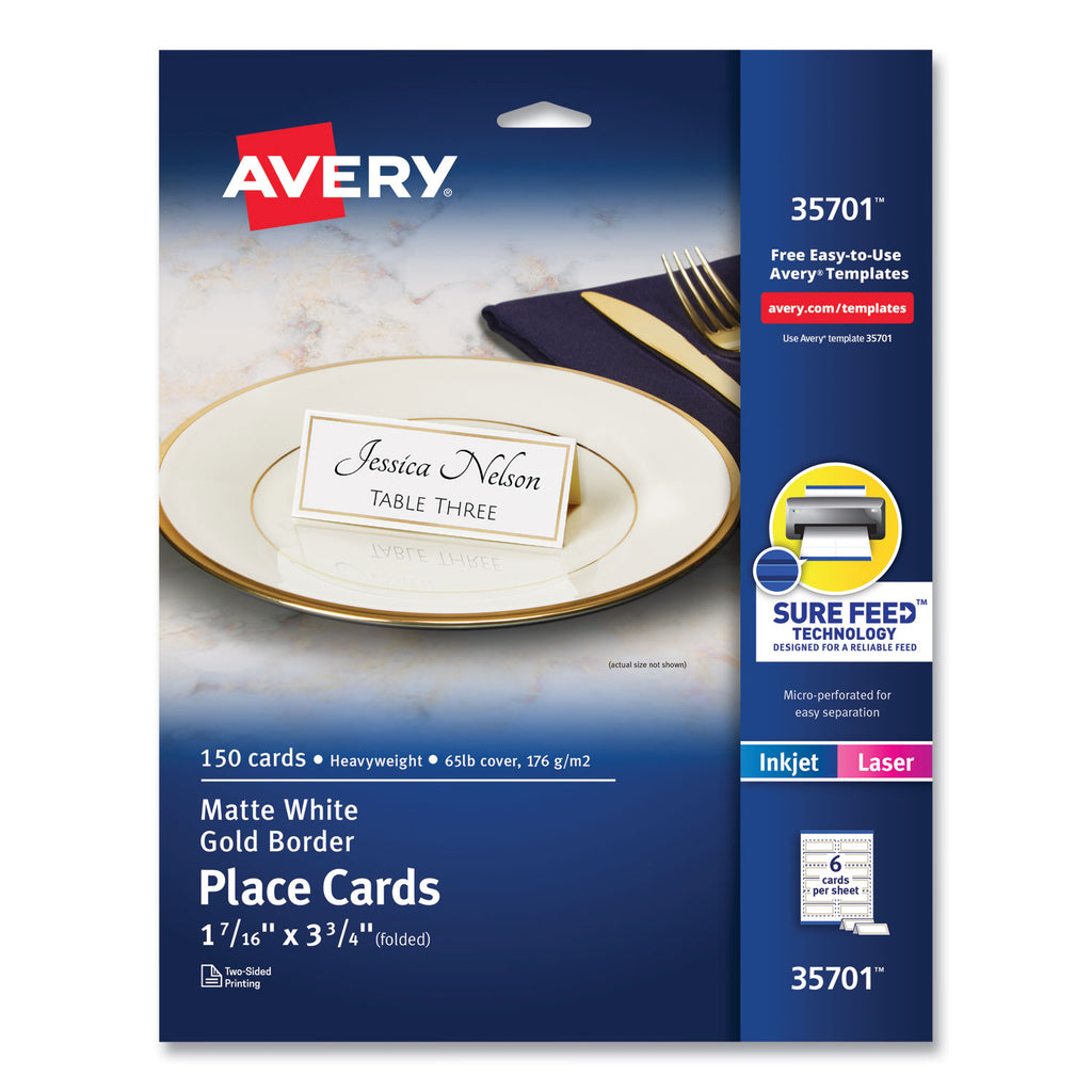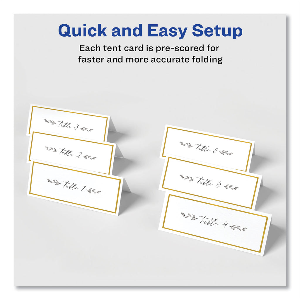Fold-over rectangular cards sit atop any flat surface for great visibility. Card stock is ideal for name cards in meetings, presentations, seminars and classrooms. Use as place cards for marking "reserved" seating at tables, weddings, catered events or for displaying any type of communication prominently. Ultra-fine perforations let you separate cards cleanly and easily for a professional appearance and are pre-scored for easy folding. Easy to customize with free designs and templates from Avery Design & Print. 8.5" x 11" sheets for laser and inkjet printers.