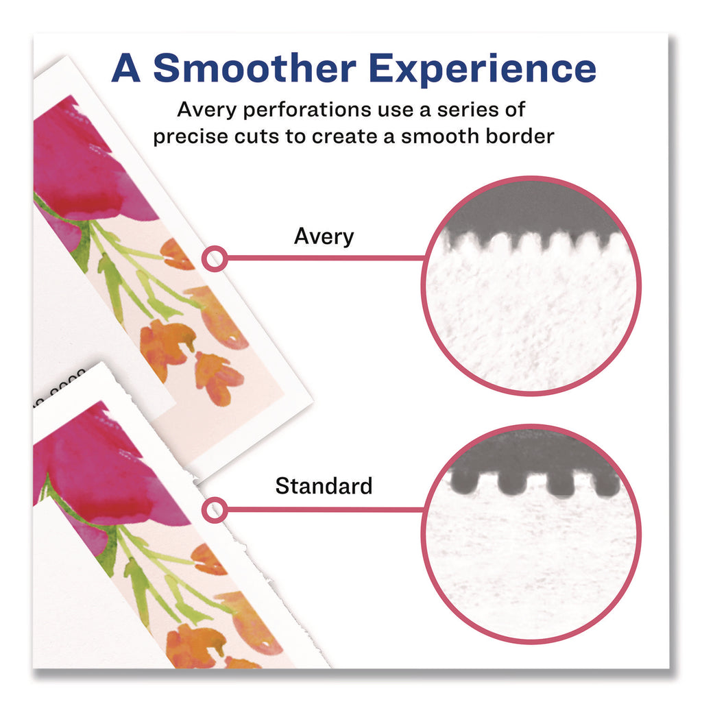 Add an elegant touch to meetings, conferences, and weddings with Avery 3328 Matte White 2" x 3.5" Cards with Metallic Gold Borders. Featuring a stunningly reflective pre-printed gold border on one side, the gilded edges add a brilliant glow to food identification cards and place cards for weddings, baby shower, anniversaries, and other celebrations. Both sides of the sheet are printable so that you can create beautiful double-sided designs. Designed to leave a smooth border, a series of precise cuts are used around the edge of each tent card to separate easily. A light indent in each tent card makes it easy to fold cleanly down the center. These cards are also made with 65lb cover/176 gsm cardstock that is compatible with both laser printers and inkjet printers. Our intuitive design software helps you line up your design within the metallic tent card borders so that your text and artwork fit perfectly. Pair these tent cards with other Avery labels, cards, tags and tent cards featuring metallic gold borders to complete the look. For best results, use the paper setting for cards and feed each sheet one at a time through your laser or inkjet printer.