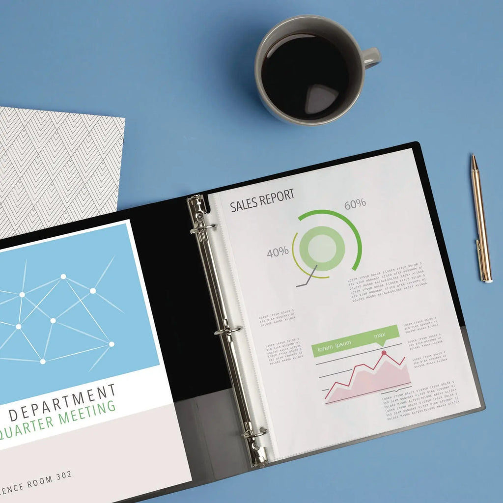 Light use binder for easy projects. Two interior pockets can be used to store handouts as well as loose or unpunched pages. Rings are mounted on back cover for a clean spine and pages lie flat.