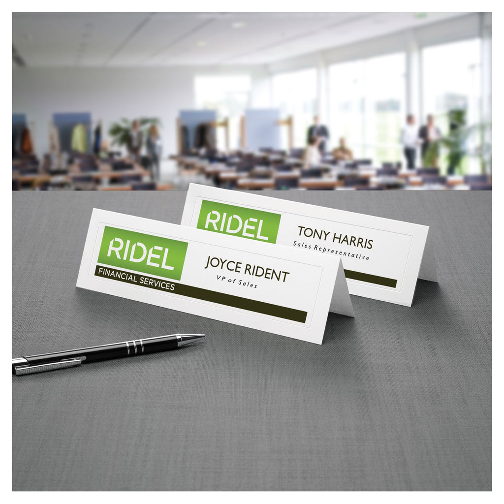 Fold-over rectangular cards sit atop any flat surface for great visibility. Card stock is ideal for name cards in meetings, presentations, seminars and classrooms. Use as place cards for marking "reserved" seating at tables, weddings, catered events or for displaying any type of communication prominently. Ultra-fine perforations let you separate cards cleanly and easily for a professional appearance and are pre-scored for easy folding. Easy to customize with free designs and templates from Avery Design & Print. 8.5" x 11" sheets for laser and inkjet printers.