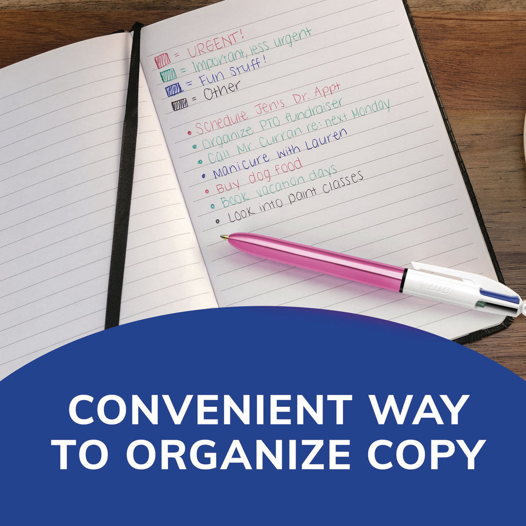 Multi-color ballpoint pen features four useful colors, all in one pen. It's ideal for color-coding, organizing notes, editing others' work and more. Standard ballpoint ink is long-lasting, and the pen is refillable.