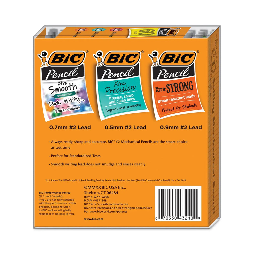 Get the best of both worlds with this mechanical pencil value pack including a 60-count mixture of fine point, medium point, and thick point mechanical pencils. The smooth writing lead does not smudge and erases cleanly with the lead advancing quickly and easily. One BIC mechanical pencil is equal to 2.5 wood case pencils, giving you more for your money. Perfect for standardized tests. Pack includes 20 Xtra Precision pencils with 0.5 mm fine point, 20 Xtra Sparkle pencils with 0.7 mm medium point, and 20 Xtra Strong pencils with 0.9 mm thick point.