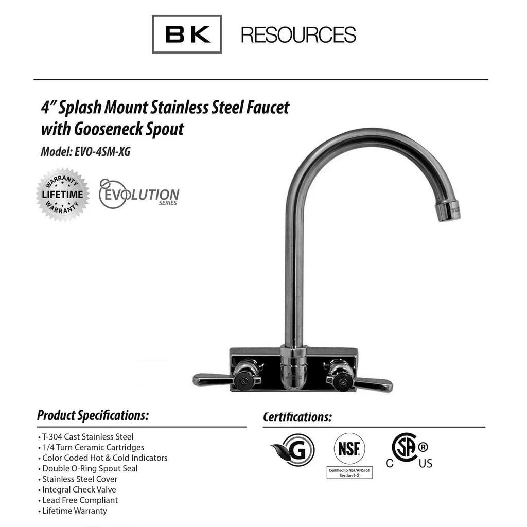 The Evolution Splash Mount Stainless Steel Faucet is distinguished by its well-crafted spout, made of T-304 cast stainless steel for durability. With 1/4 turn ceramic cartridges and an integral check valve, this faucet ensures smooth and reliable performance. The chrome-plated metal cover adds a touch of elegance to its design. Importantly, it is lead-free and complies with ANSI/NSF 61 and cCSAus standards, emphasizing its commitment to safety and quality. This faucet is a reliable and stylish choice, combining modern features with high-quality materials.