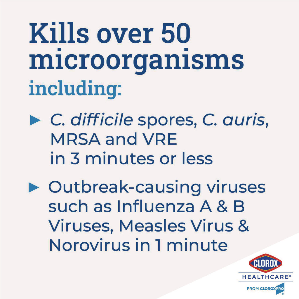 Clorox Healthcare Bleach Germicidal Cleaner is proven to kill C. diff and C. auris in three minutes and recommended for use in healthcare settings.