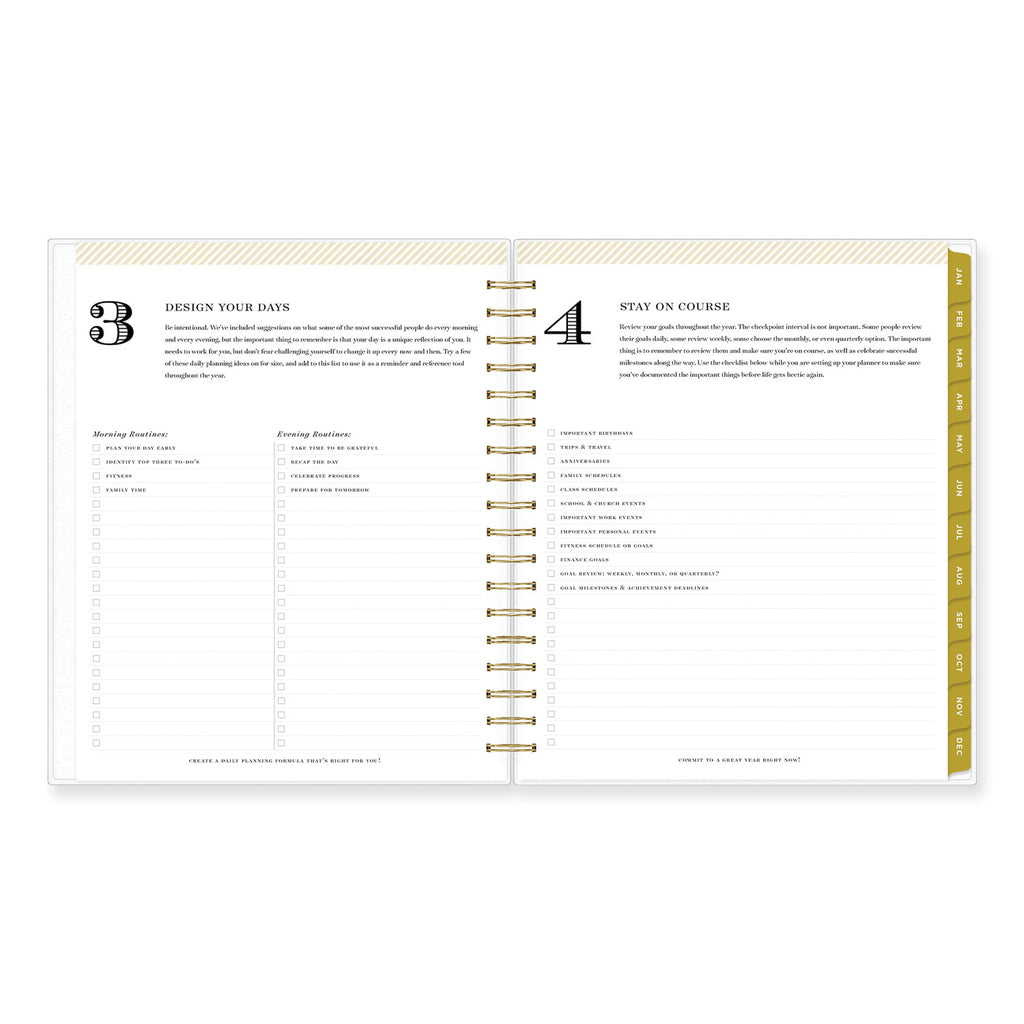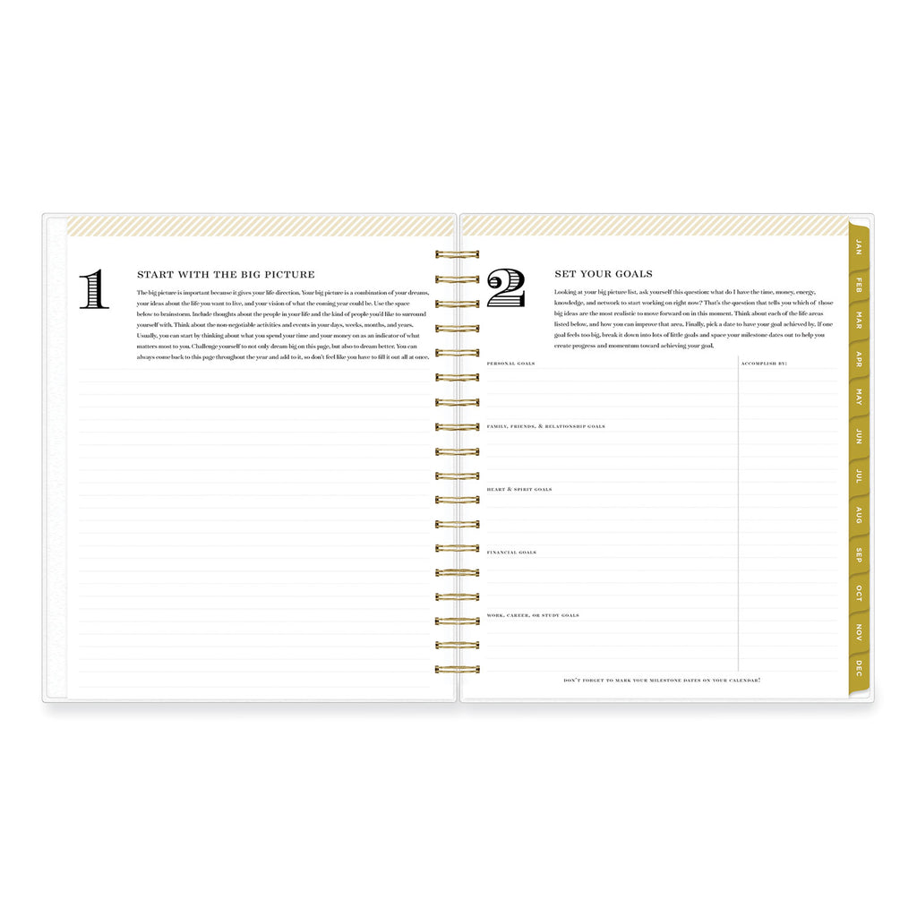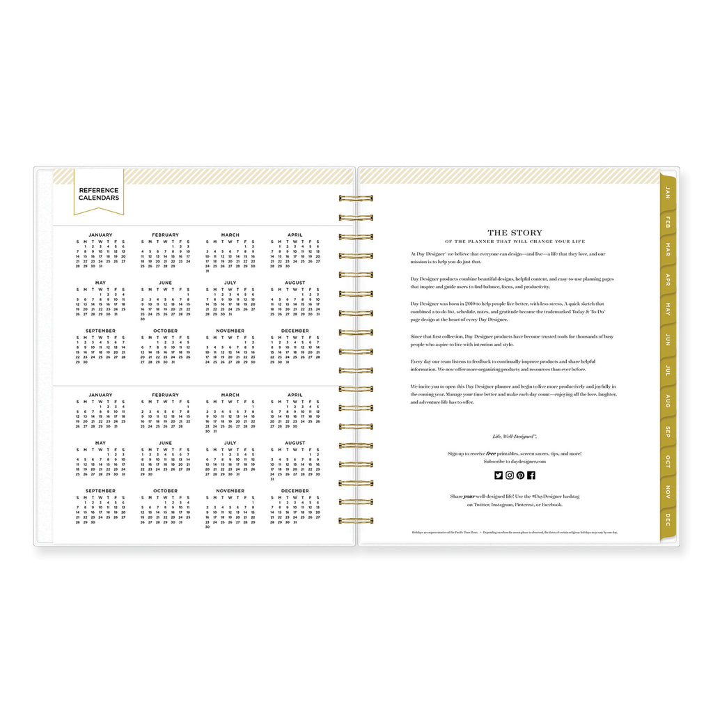Design your life with Day Designer. An introductory letter from Whitney English and special worksheets designed for identifying and fulfilling your personal goals get you started. Daily planner section features one-day per page views Monday through Friday and two-day per page views for Saturday and Sunday. Two-page per month spreads feature ruled daily blocks and a Notes & To Do checklist.