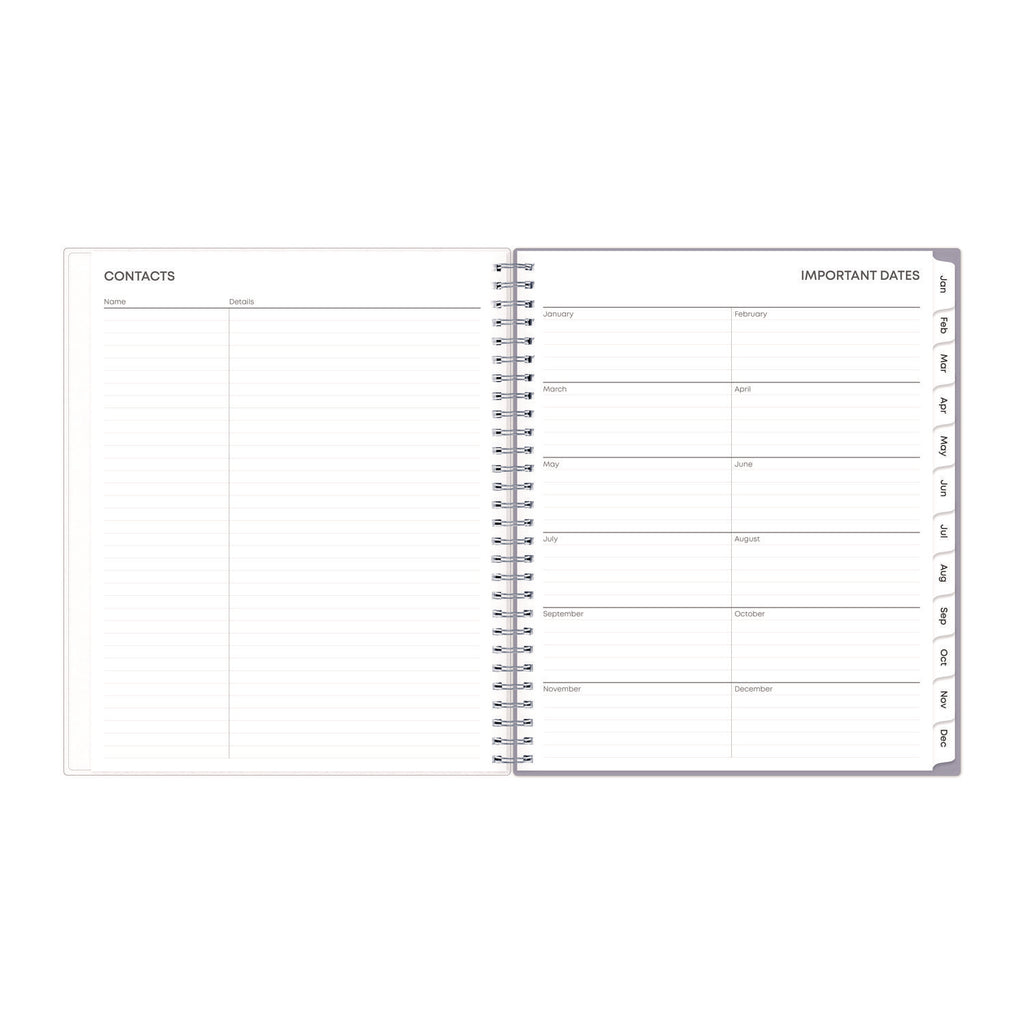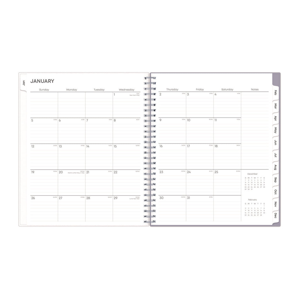 Add a touch of style to getting organized. Durable, coated monthly calendar tabs allow for easy access to your month views while the two-page layout offers plenty of writing space for detailed scheduling throughout the calendar year. Six bonus past months allow for easy annual transitions. Frosted flexible front, solid back cover and twin-wire binding finishes the look and ensures easy page turning. Printed with soy-based ink.
