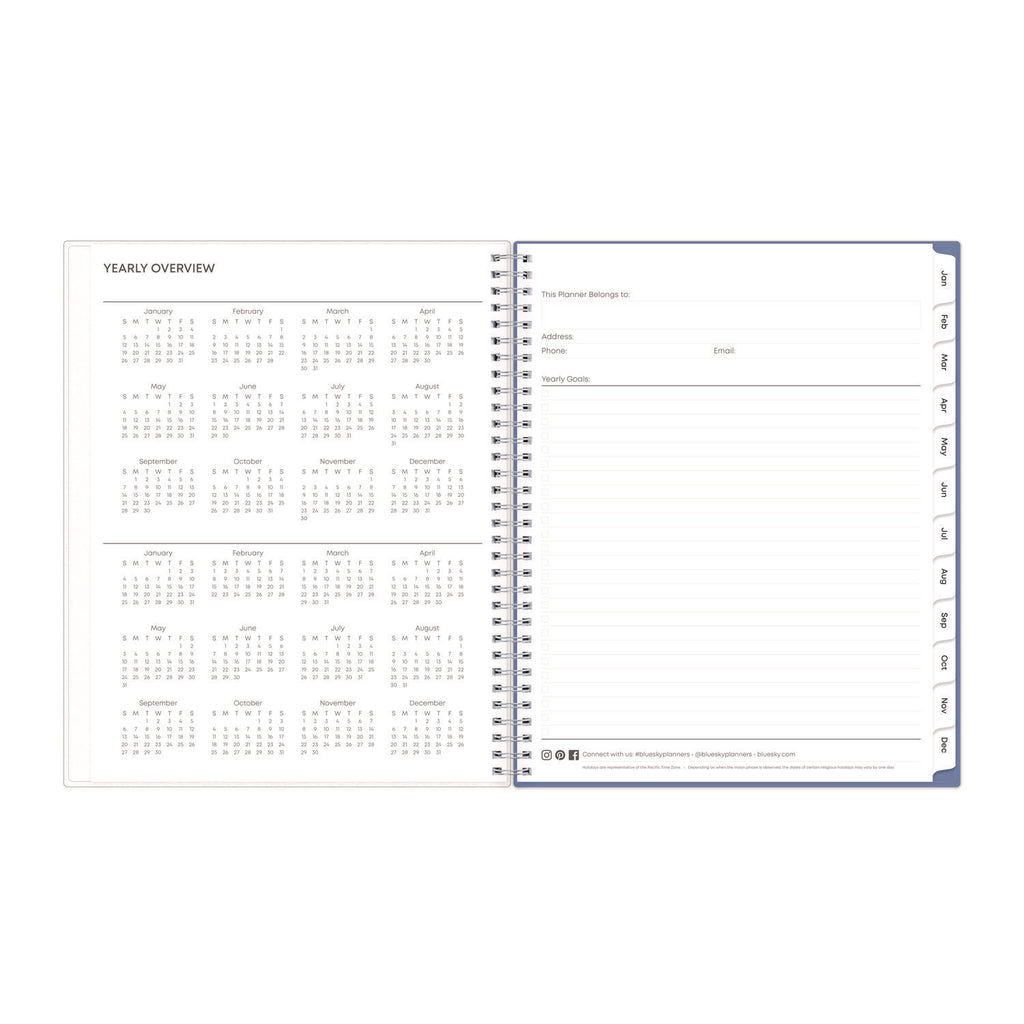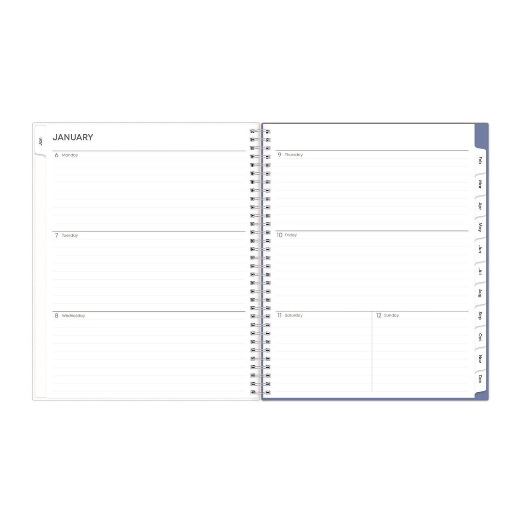 Standard calendar year plus six bonus months of two-page spread per month. Weekly views per two-page spread offer ample writing space. Durable coated monthly calendar tabs allow for easy access to each month. Thick, premium acid-free pages reduce ink bleed-through. Features a double-sided paper storage pocket page. Durable frosted flexible front and solid back covers. Twin-wire binding finishes the look and offers easy page turning. Printed with soy-based ink.