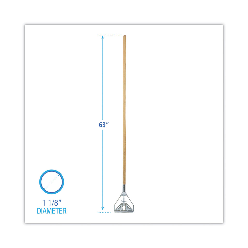 This quality wood mop handle is designed to be sturdy. The double-riveted metal clamp is securely fastened to the handle for extra strength. Made from solid wood and slightly lacquered for an easy, smooth finish that resists water and splintering. Wing-nut screw adjust to fit the size of the mop head, which is sold separately.