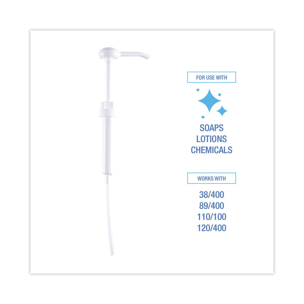 Pump contains a convenient, easy storage plunger that locks down to reduce its height for compact storage. The easy-to-use, siphon pump is great for a variety of applications where it's more convenient to use a hand pump than remove a cap and squeeze out. The reliable pump can be used with soaps, lotions, and chemical concentrates. The versatile pump fits multiple adaptors; including 38/400, 89/400, 110/400, 120/400.