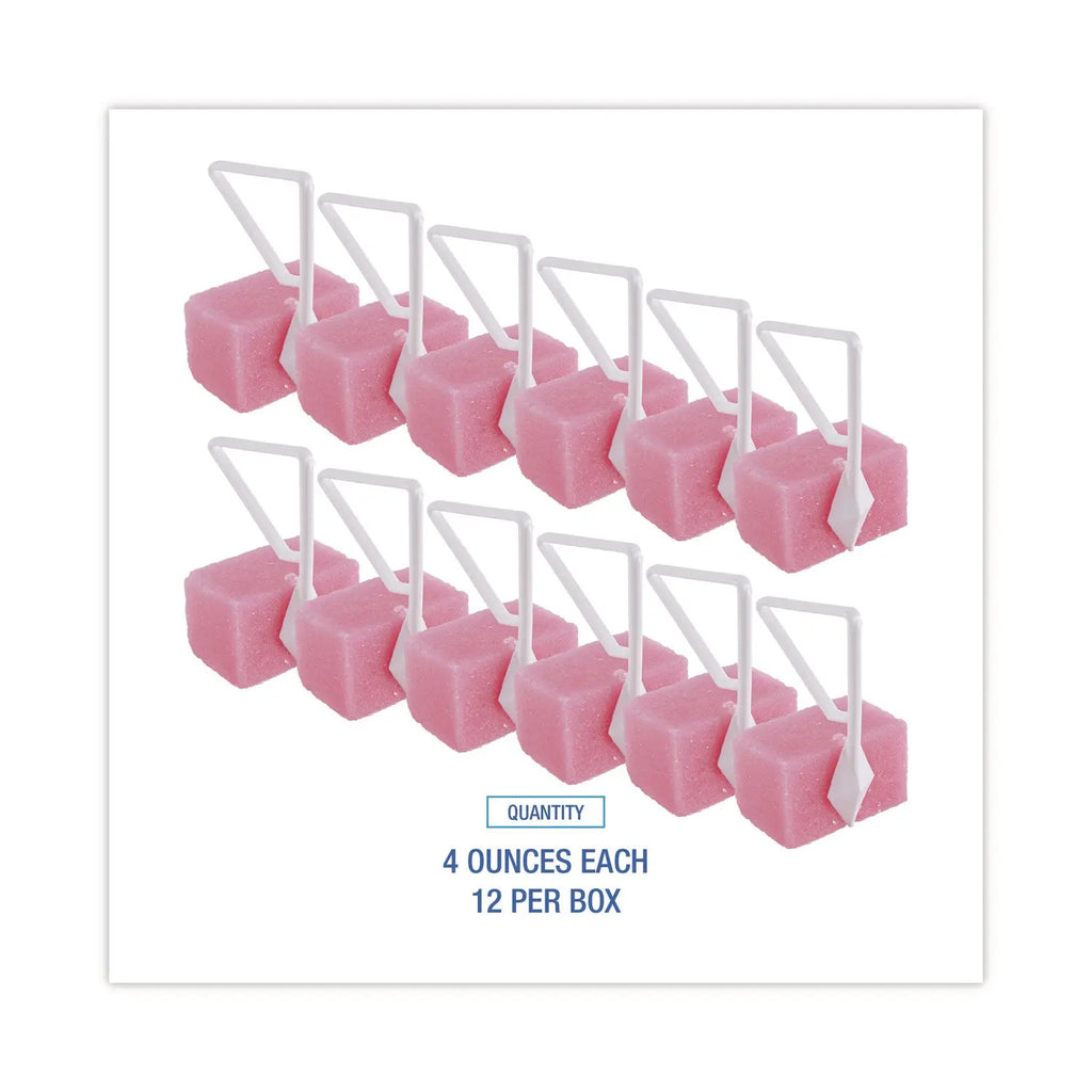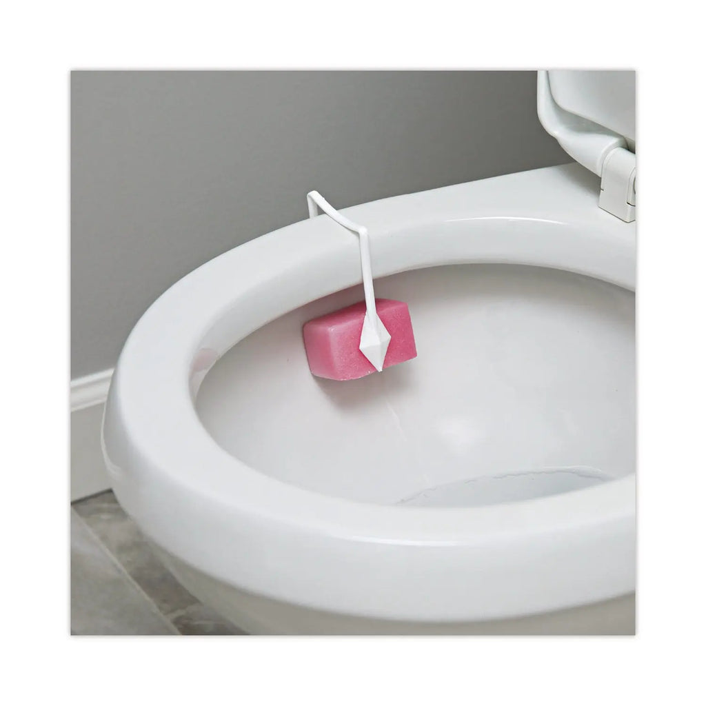 Toilet bowl deodorizer block is constructed with a plastic hanger that's a pressure-sensitive clip to hold paradichlorobenzene block in place. Each block is individually cellophane wrapped to keep it fresh and the block intact. Will not chip and break off pieces to clog the toilet. The air-activated paradichlorobenzene block is saturated with liquid deodorants to freshen the air.
