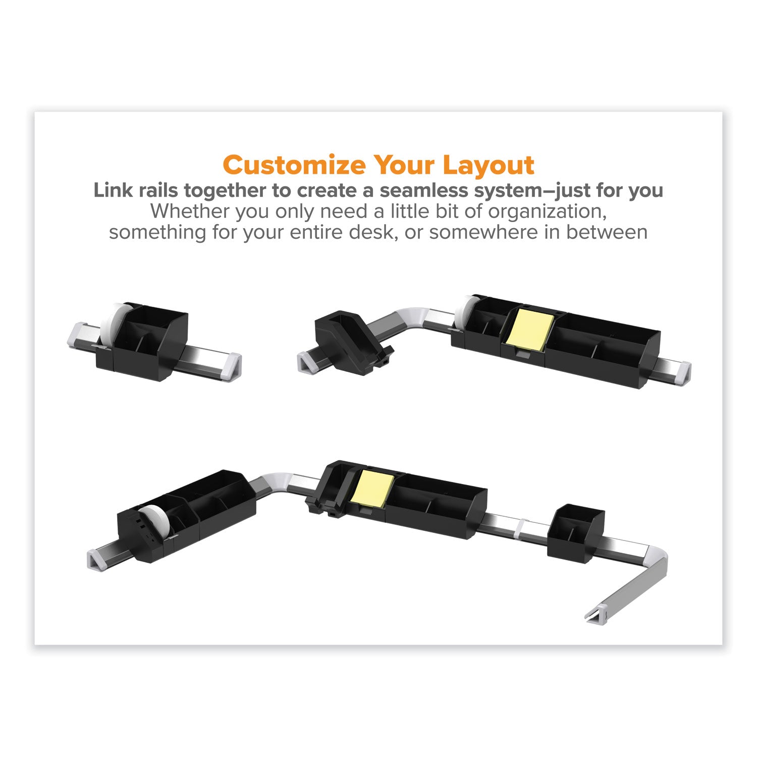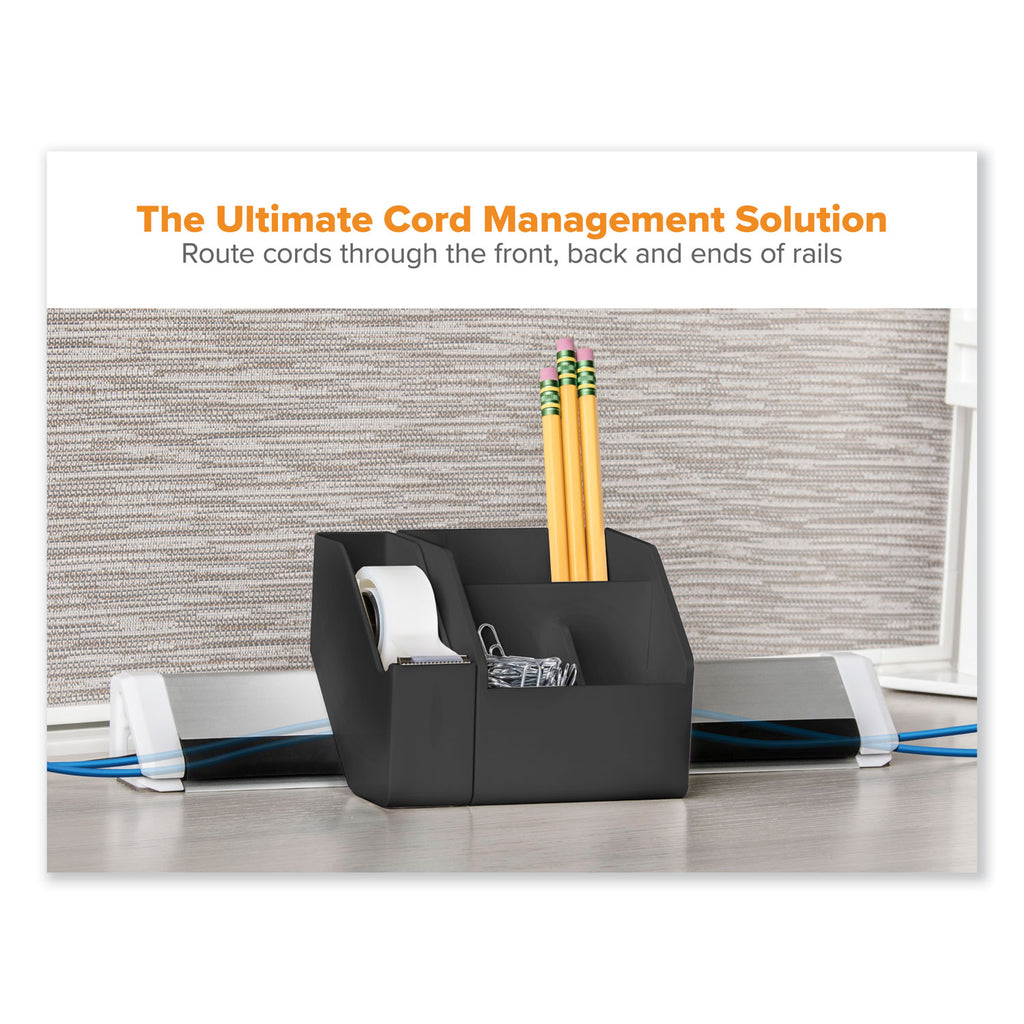 • Includes two 12 cord management rails, one 21.5 cord management rail, one short storage bin, one wide storage bin, one tape dispenser, one sticky note holder, one USB phone dock, and one power hub.