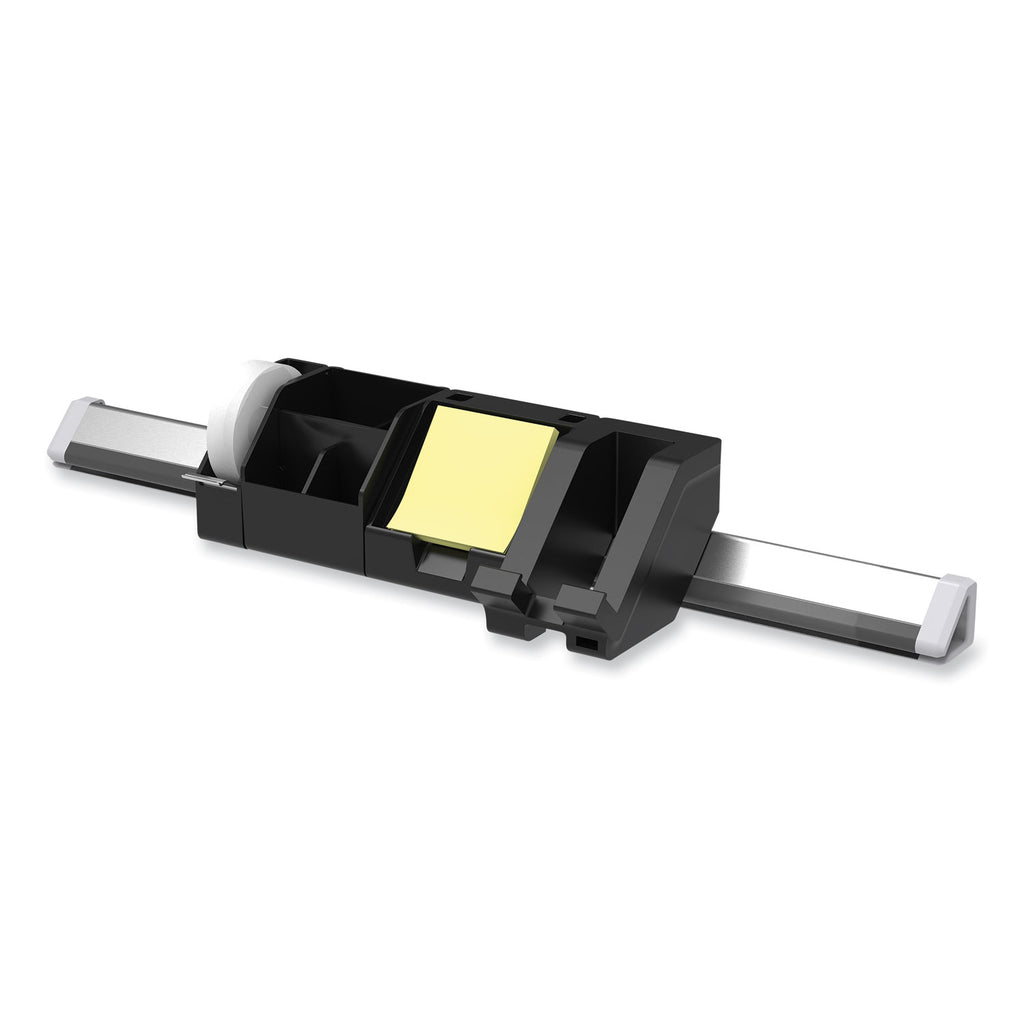 Provides a fully functional desktop from corner to corner. Hide unsightly cords and tangled wires with the 21.5 cord management rail. It also allows you to dock any of the Konnect™ accessories right to your desktop. Four unique docking units are included in this office supply organizer kit. The tape dispenser is thin and compact, allowing for easy dispensing with the extended blade. It comes with a roll of office tape to keep you prepared. The sticky note holder holds business cards and sticky notes, preventing fly-away memos from getting lost. The short storage bin holds tacks, pens and a variety of other small items that are essential to your office. The USB phone dock offers a safe area to keep your phone. It features a USB port for easy device charging and viewing. Konnect™ is an easy fix for desktop clutter, combining all work essentials into one desk organizer system.