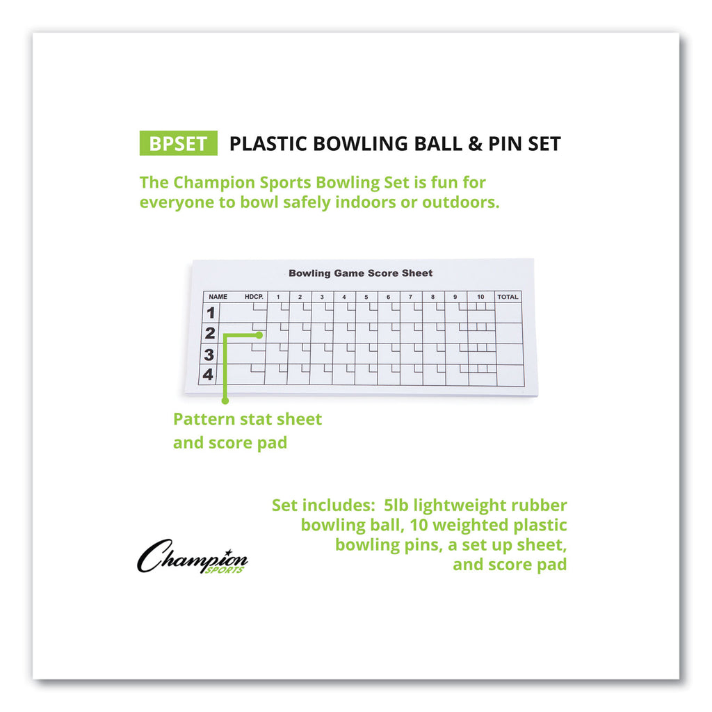 Want to bring the fun of bowling anywhere, anytime? This complete kit is perfect for families, parties, or even a casual game night with friends. The lightweight 5-lb rubber bowling ball is easy for bowlers of all ages and skill levels to handle, while the weighted plastic pins ensure a realistic bowling experience. Setting up your own bowling alley is a breeze with easy-to-follow instructions. The score pad keeps track of all the strikes and spares. No need for expensive bowling shoes or fancy lanes—with the Champion Sports Bowling Set, you can transform any space into a bowling haven in minutes. Get ready for hours of laughter, friendly competition, and classic bowling fun—all from the comfort of your own home or backyard!