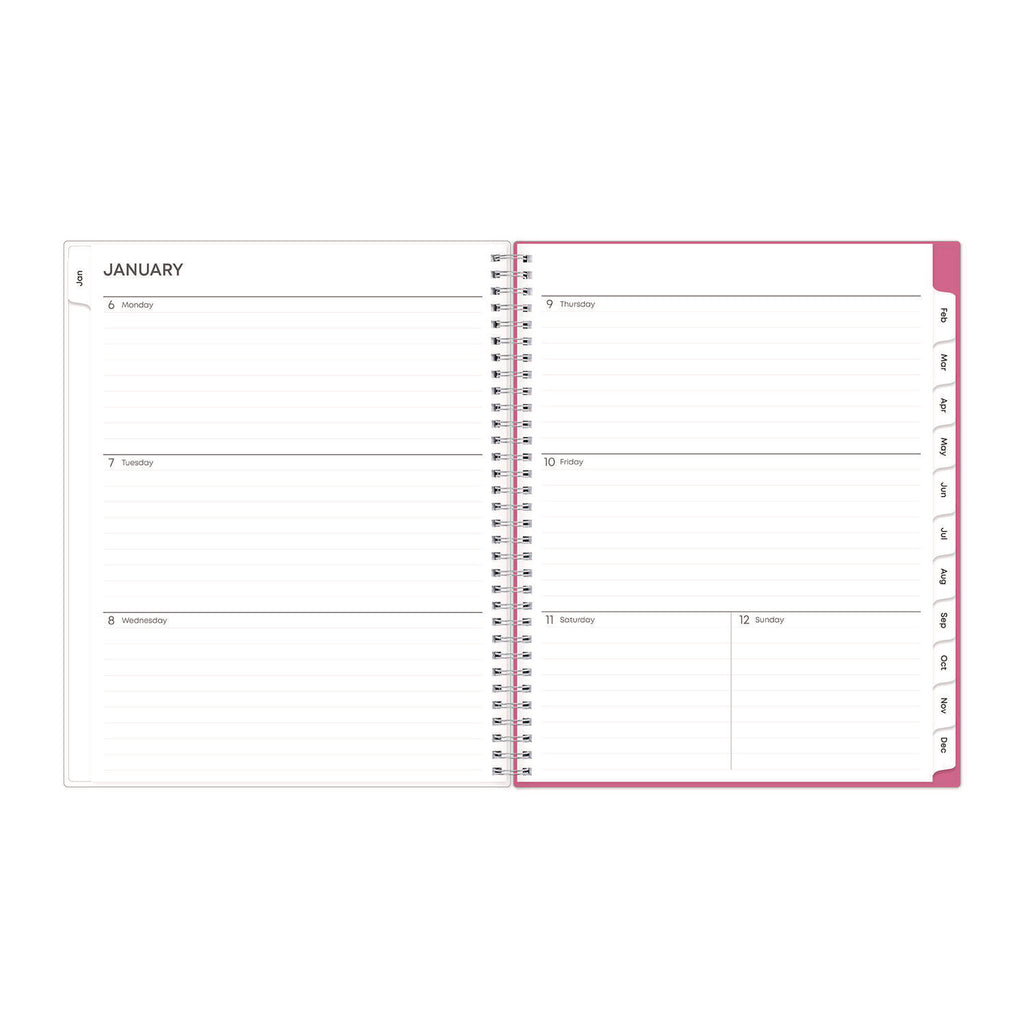 - Weekly view per two-page spread offers ruled days Monday to Sunday with ample space for planning.
