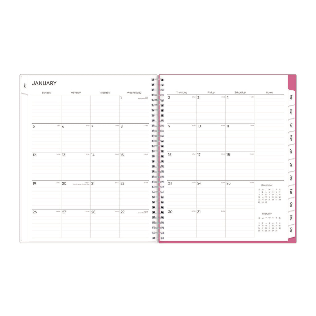 Two-page per week spreads include ruled daily entries with ample space for planning. Two-page per month spreads feature ruled daily blocks, a ruled notes column, highlighted holidays, count of days-past/days-remaining as well as past and future month reference calendars. Monthly tabs are coated for durability. Create-Your-Own cover with clear overlay doubles as a storage pocket, allowing you to display photos or artwork and instantly change the look of your planner.