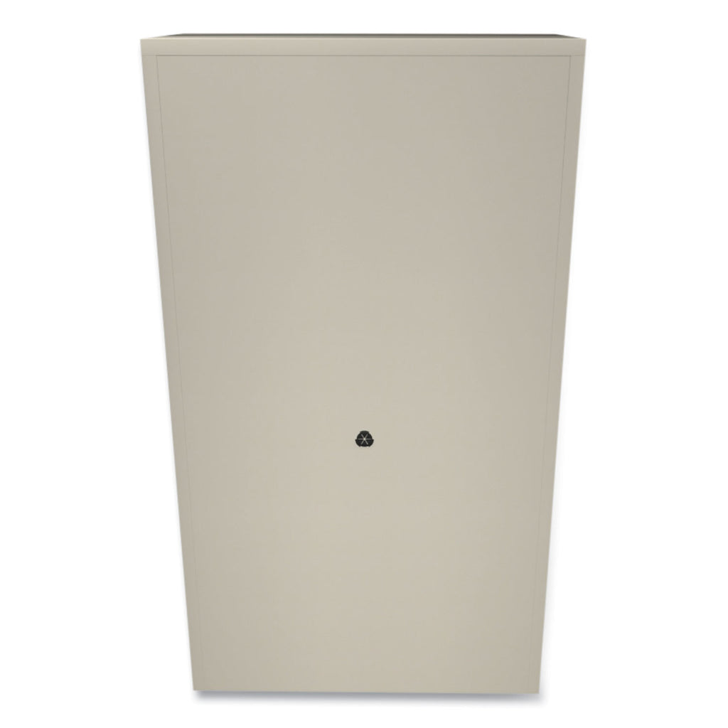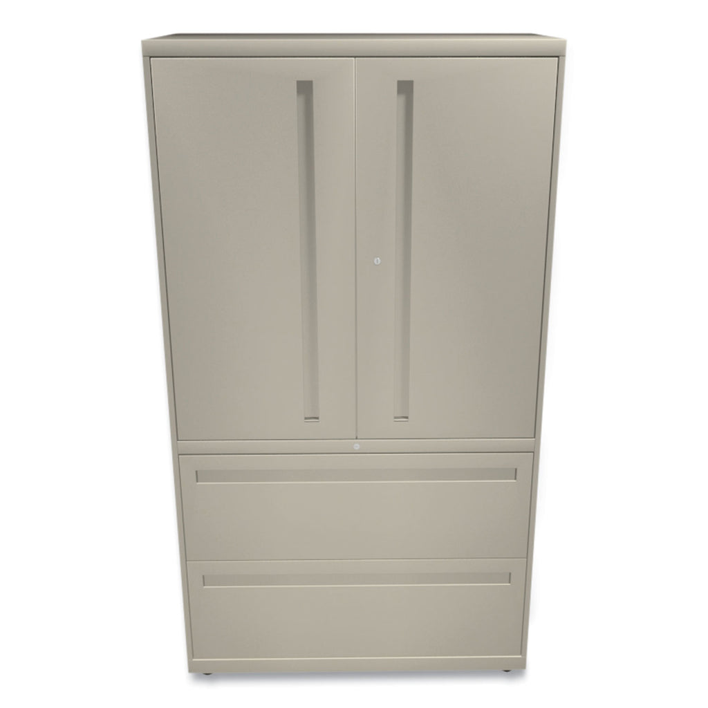 Hinged doors conceal 36 1/4" storage space with two adjustable shelves. Bottom shelves hold two rows of three-ring binders. Two lateral file drawers with steel bearing suspension for letter/legal size filing. Keyed alike locks secure doors and lateral file drawers independently.