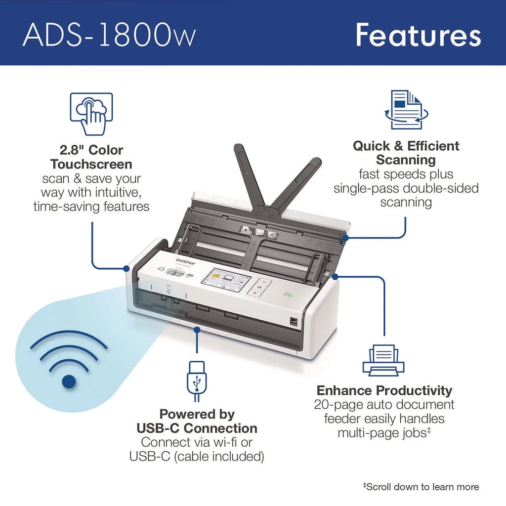 Versatility and productivity combine in the powerful Brother ADS-1800W Compact Desktop Scanner. Ready to work where you need it home, office, or on the go with the Brother Mobile Connect App and Wi-Fi connection. Send scans directly to your computer or favorite Cloud service and use the handy 2.8" color touchscreen to automate your workflow. Scan cards, paper or plastic, using the specialized built-in card reader, and enjoy single-pass double-sided scanning via the 20-page automatic document feeder. Powered directly through a USB computer connection, the space-saving design helps keep your workplace organized. Manage and enhance scanned files with the robust software bundle.