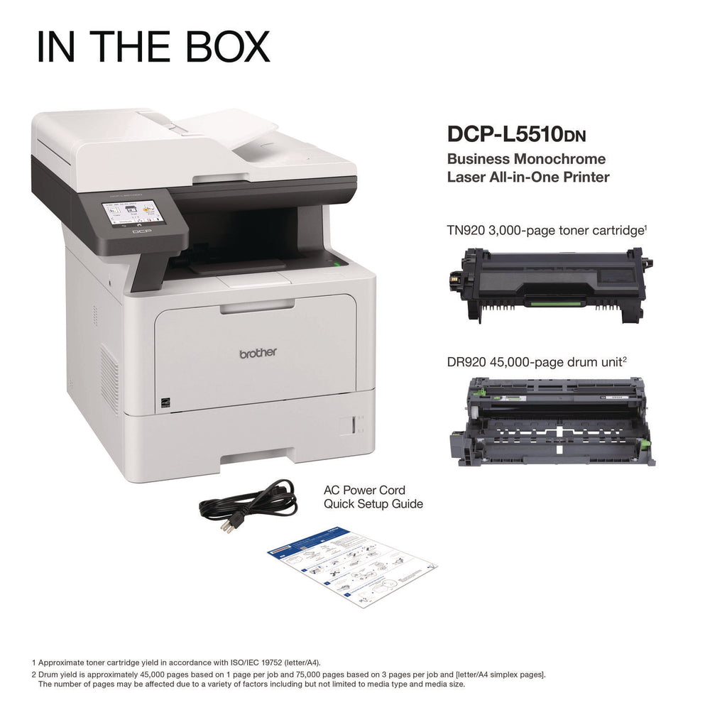 A great choice for busy offices and small workgroups that need cost-efficient printing, versatile paper handling, advanced security features, and reliable output. Helps to increase productivity with fast printing and copying up to 48 ppm. Delivers cost-efficient printing by using the Brother Genuine TN920XXL super high-yield replacement toner cartridge. Multi-page scanning. Scan to popular destinations directly from the touchscreen display. Triple Layer Security features help to limit document and device access and protect against network intrusions. Expandable paper capacity. Gigabit Ethernet interface. Easily print from and scan to mobile devices.