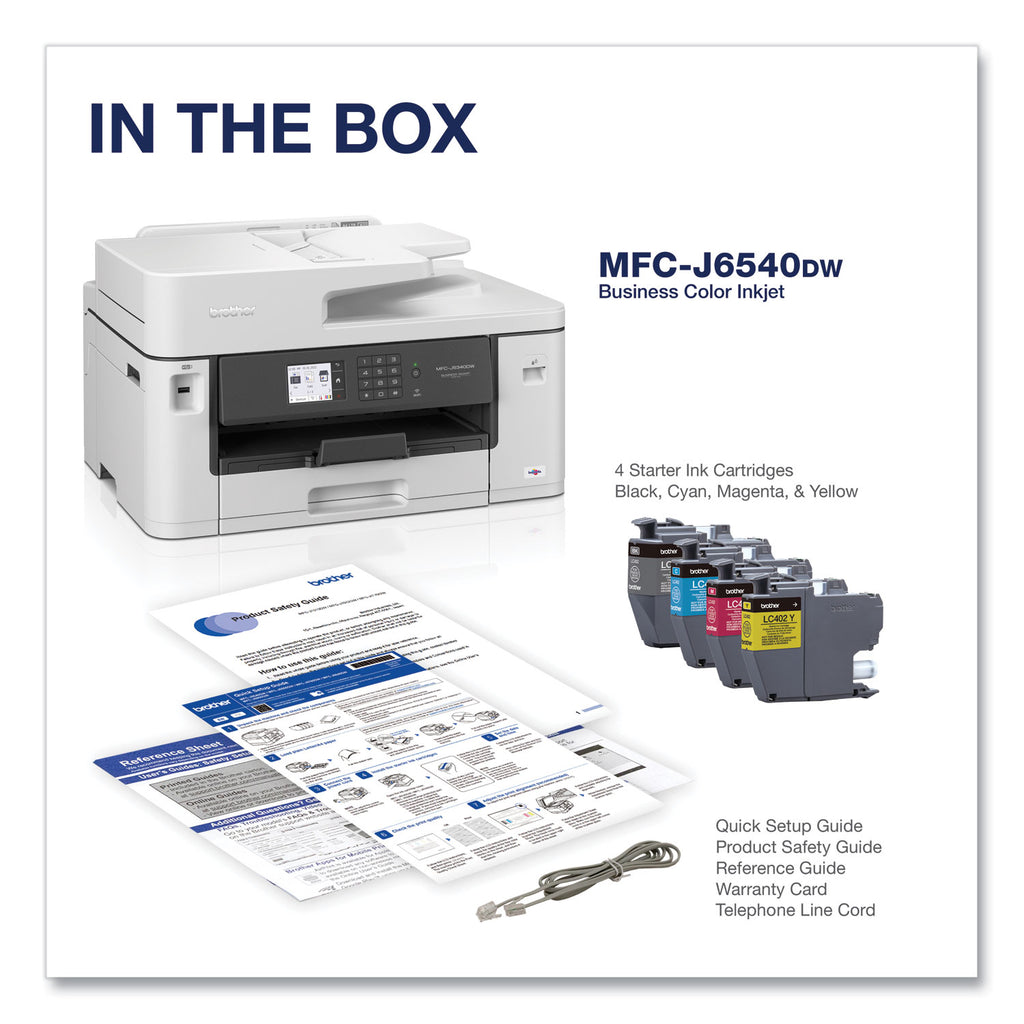 The MFC-J6540DW Brother Color Inkjet All-in-One Printer delivers economical, reliable, professional-quality printing for any small office or home workspace. Print, scan, copy, and fax up to 11" x 17" (ledger) size paper. This all-in-one print solution raises the bar on simplicity and productivity. With print speeds up to 28 ppm (black and color), and the 250-sheet paper tray capacity makes handling large print jobs a breeze. Robust Triple Layer Security helps safeguard sensitive documents and securely connect to the device and network while printing. Work the way you want - it's easy to connect and print wired, wirelessly (2.4 GHz/5 GHz), or even on the go with the Brother Mobile Connect App. This printer comes with compatible cartridges for the Brother Refresh EZ Print Subscription Service, which can help erase the worry of running out of ink ever again. Have it all, at an affordable price, with the Brother MFC-J6540DW Color Inkjet All-in-One Printer.
