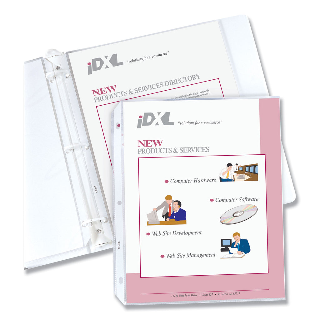 Strong, reinforced edges prevent tears. Top-loading sheet protectors are pre-punched to fit standard three-ring binders. The acid-free polypropylene material eliminates photocopy transfer and provides a good storage option for documents.