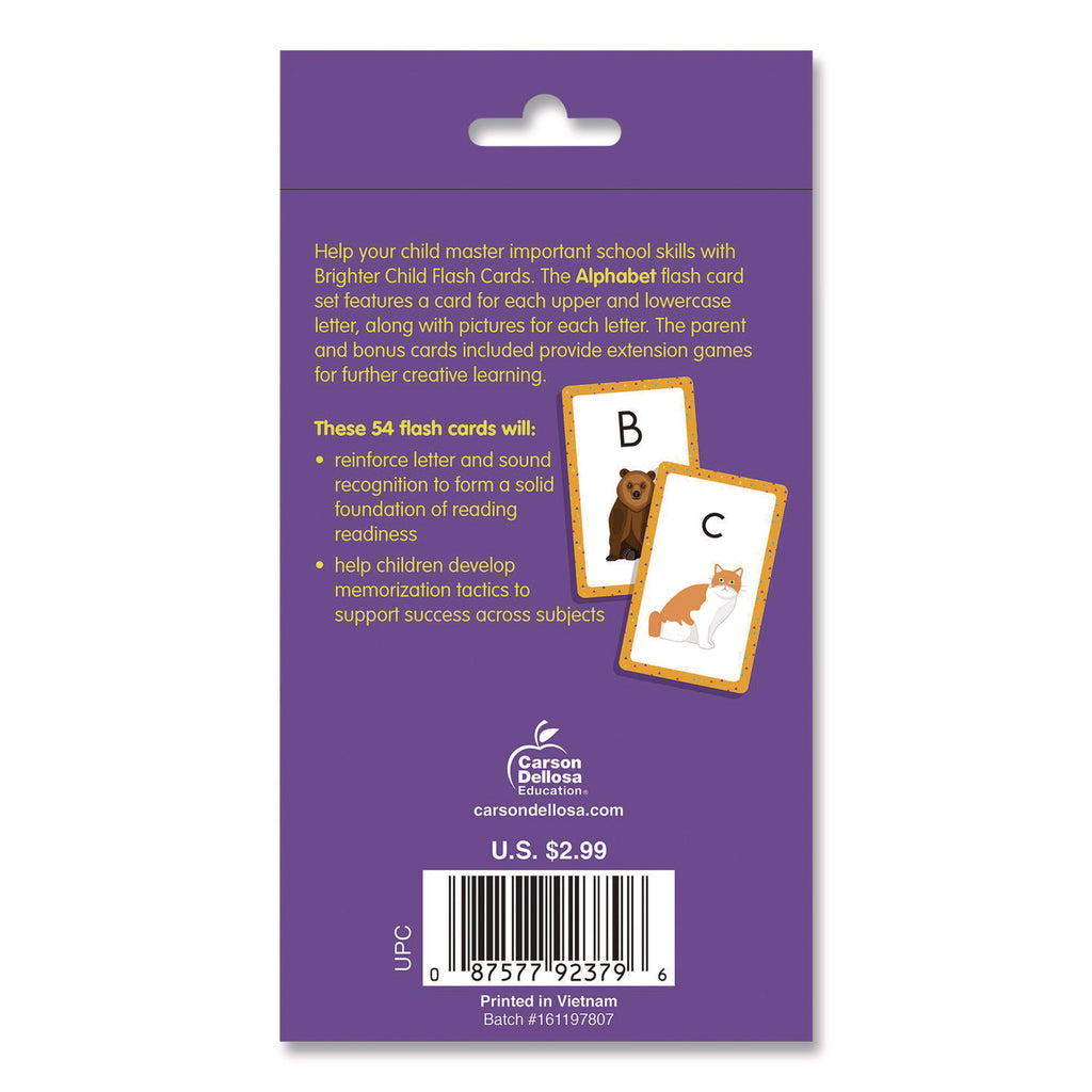 Alphabet Flash Cards present an easy, fun way for kids to practice essential skills. This 54-card set helps children recognize upper and lowercase letters, strengthen their phonics recognition, and more. This flash card box set includes cards with upper and lowercase letters (two cards for each letter), as well as two bonus game cards. With charming full-color illustrations picture cues of each letter, these flash cards are great reading readiness reinforcement. Flash cards allow kids to develop critical thinking, decision-making, turn-taking and other skills while allowing them to learn in a hands-on way.