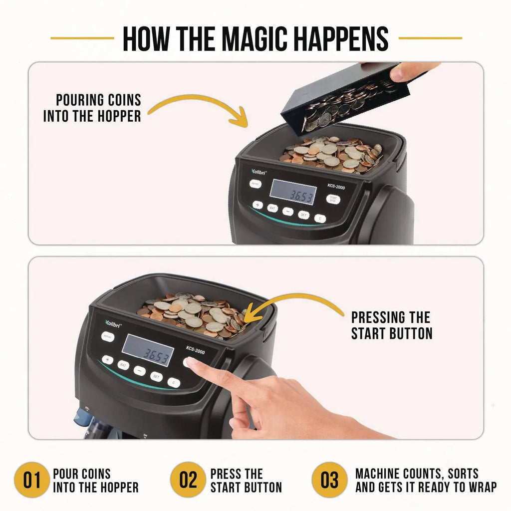 - Simply pour your coins into the hopper, press Start, and the machine will automatically count, sort and wrap your coins; see the total value of the coins counted on the screen and press Report to get the breakdown by denomination.