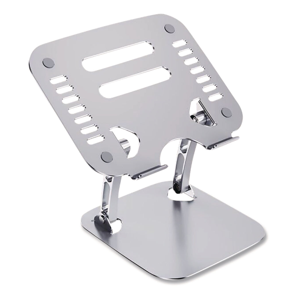 The OTM Essentials adjustable riser laptop stand helps raise your laptop to an ideal working position. Aluminum for a sleek look that is both portable and lightweight.