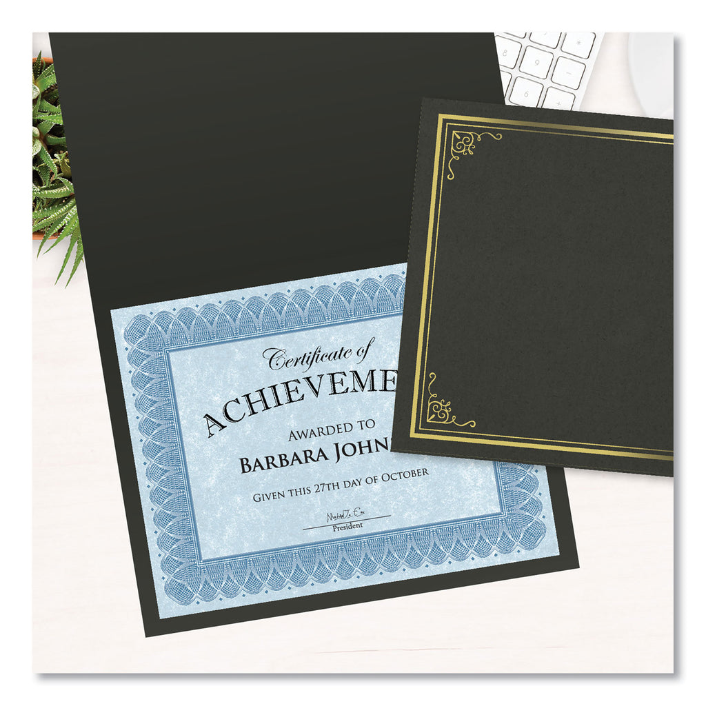 Premium 80-lb linen textured cover stock with elegant gold-foil design. Covers enhance presentations of assorted documents including certificates, photographs, menus or artwork. 12.5" x 9.75" covers fit 8.5" x 11", A4 and A10 size documents.
