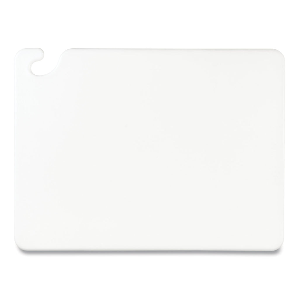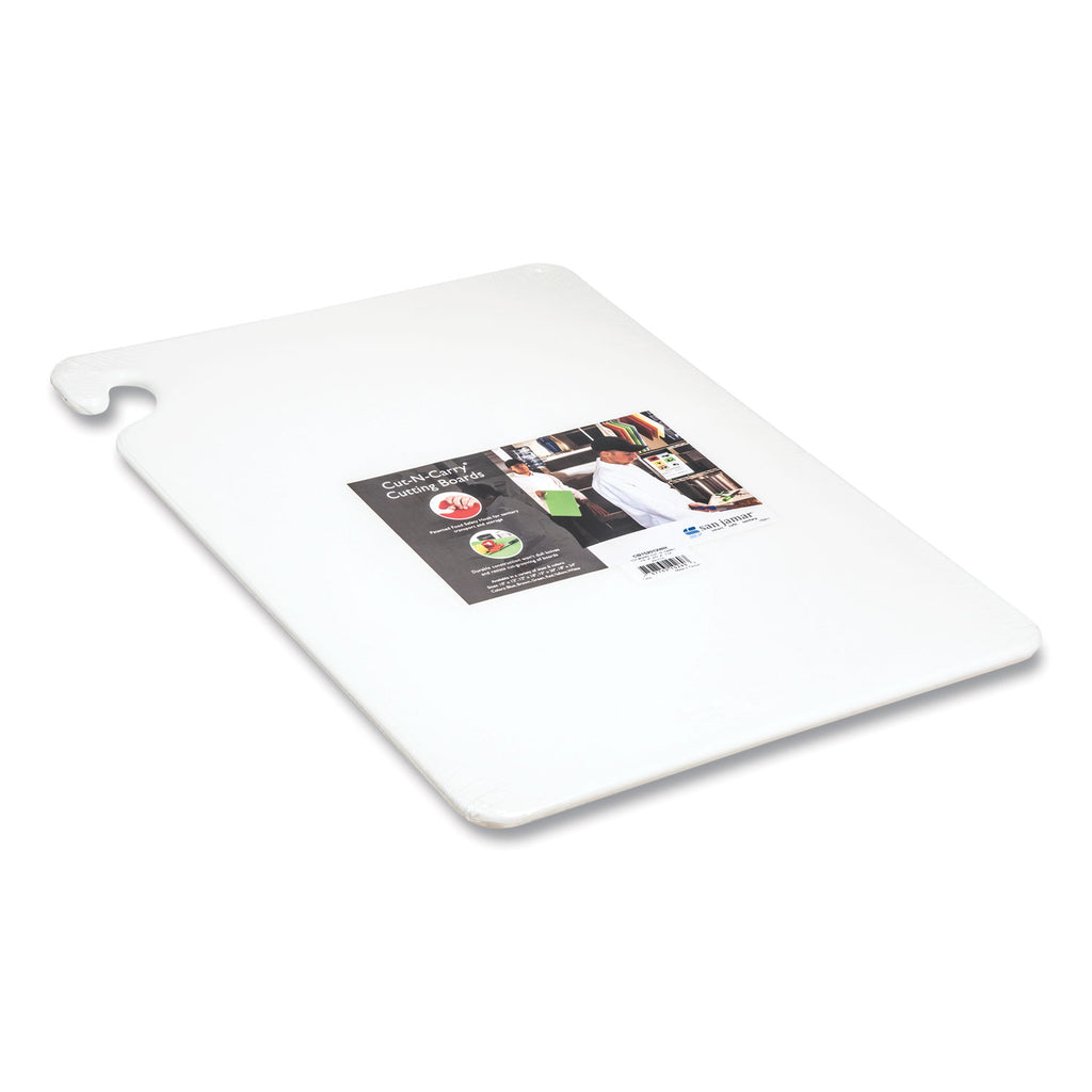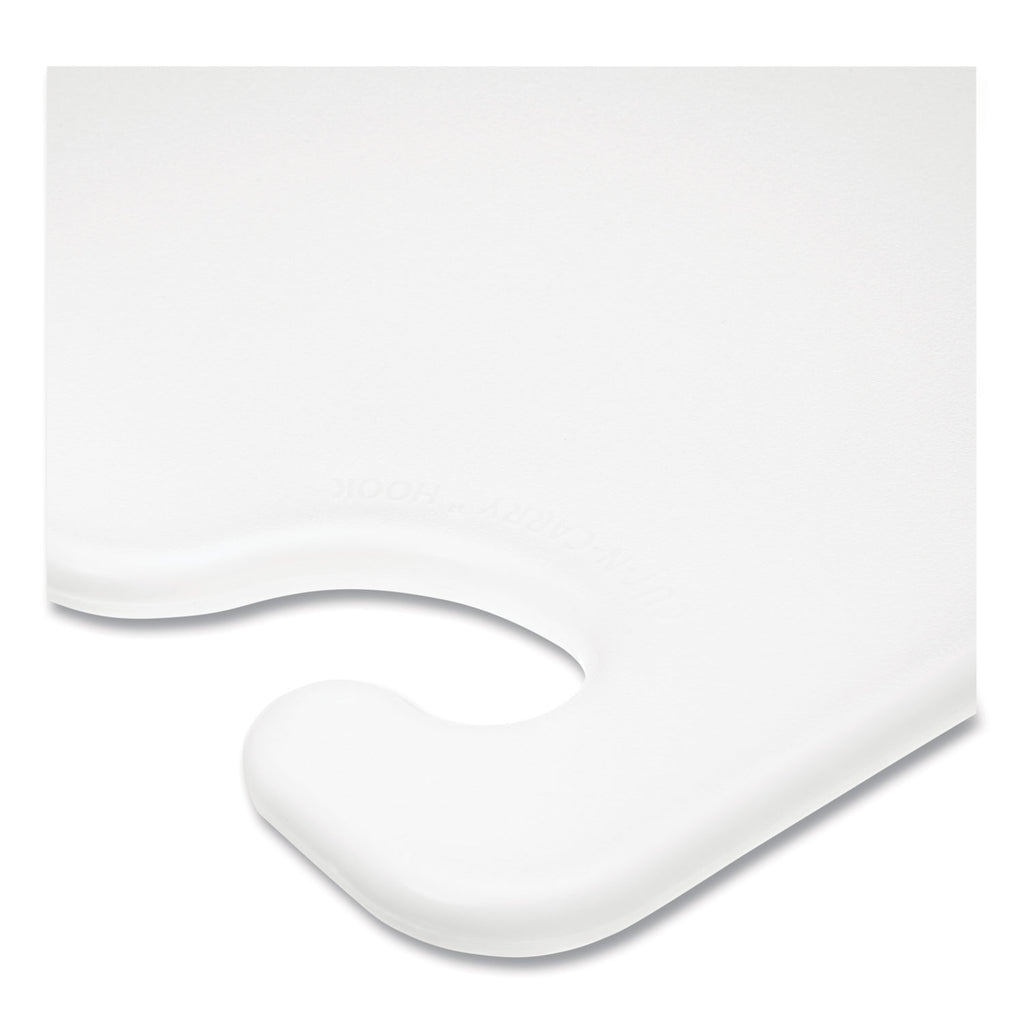 Safety Hook design enables you to carry the board without touching the surface, eliminating the potential for cross contamination. Resin-blend material protects against cut grooves without dulling kitchen knives. May be hung for drying and storage.