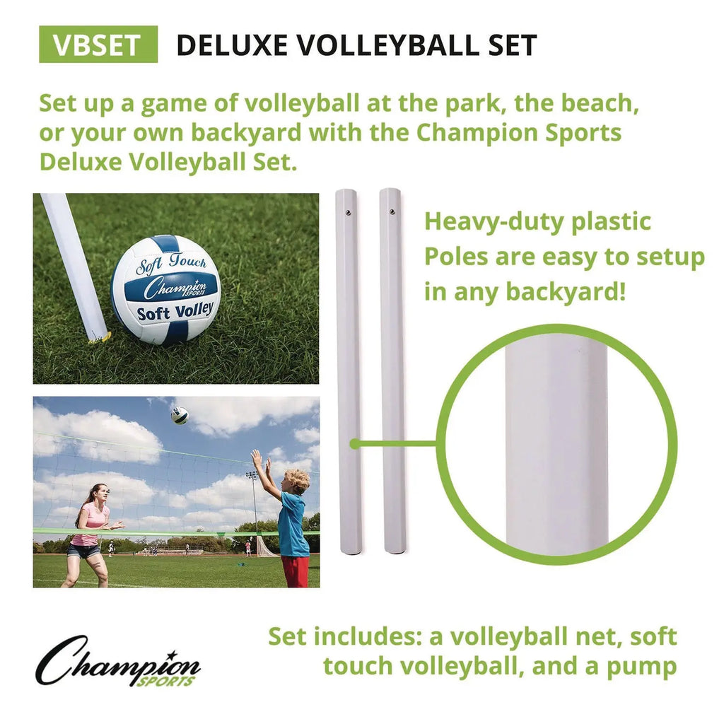 - Our deluxe set includes a 32-ft volleyball net with sturdy plastic poles, two pole anchors, four ground stakes, a volleyball, a ball inflating pump and a convenient black carrying case.