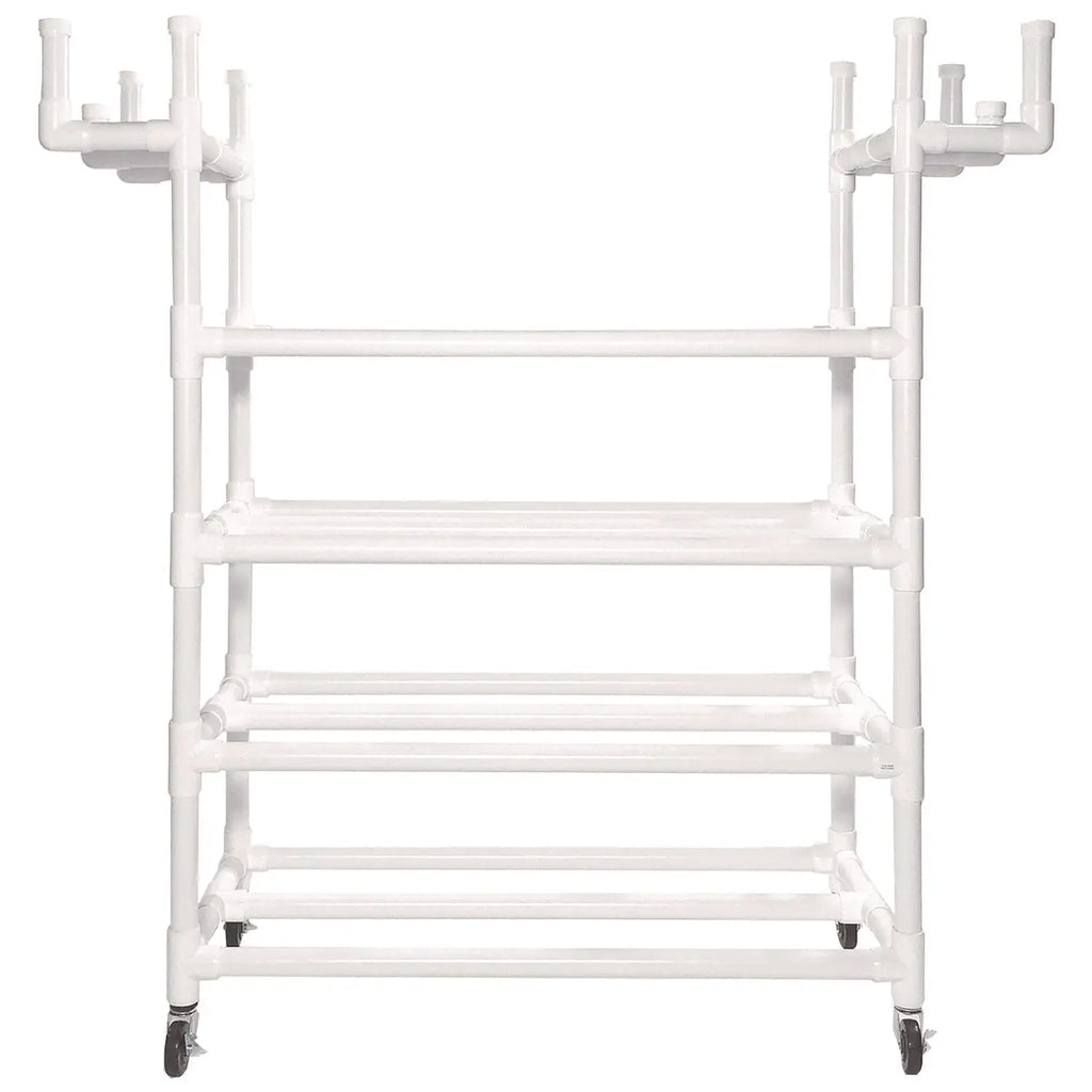 Keep your gym organized with this cart. Made of durable plastic, and equipped with heavy-duty swivel casters, this versatile equipment cart can be maneuvered out of the way whenever you want to free up more floor space. The cart features four tiers that can hold up to 32 basketballs or 40 soccer balls, 150 jump ropes, and 48 hoops. This handy cart helps organizes and transports sports equipment with ease.