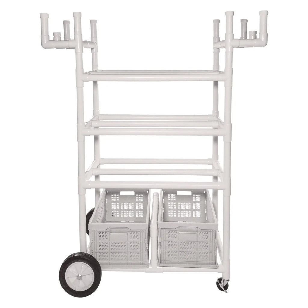 This cart is the ultimate in versatile indoor and outdoor equipment transport. Constructed of durable plastic with two large removable baskets, this cart rolls on heavy-duty all-terrain rear wheels and front swivel casters. The cart also features convenient foldaway handles and the space to carry up to 24 balls, plus hoops, jump ropes and other accessories.