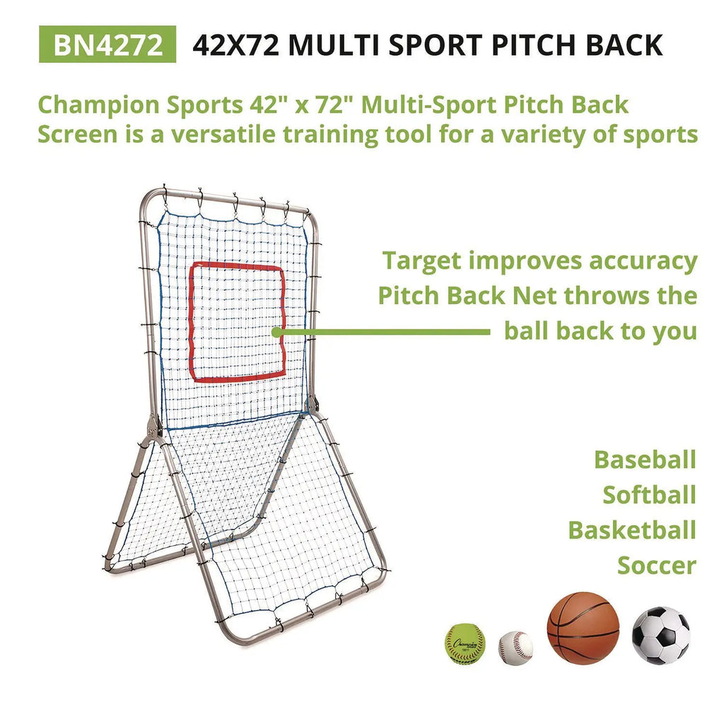 Great for schools, parks and backyards, our back screen is a versatile training tool for a variety of sports. The practice screen rotates to different angles to help athletes practice kicking, batting catching and throwing, all with the same piece of equipment. The multi-sport pitch back screen is made with a tough steel frame and durable nylon netting that can endure even the most intense hits with ease, and it has a square target in the middle to help improve accuracy.