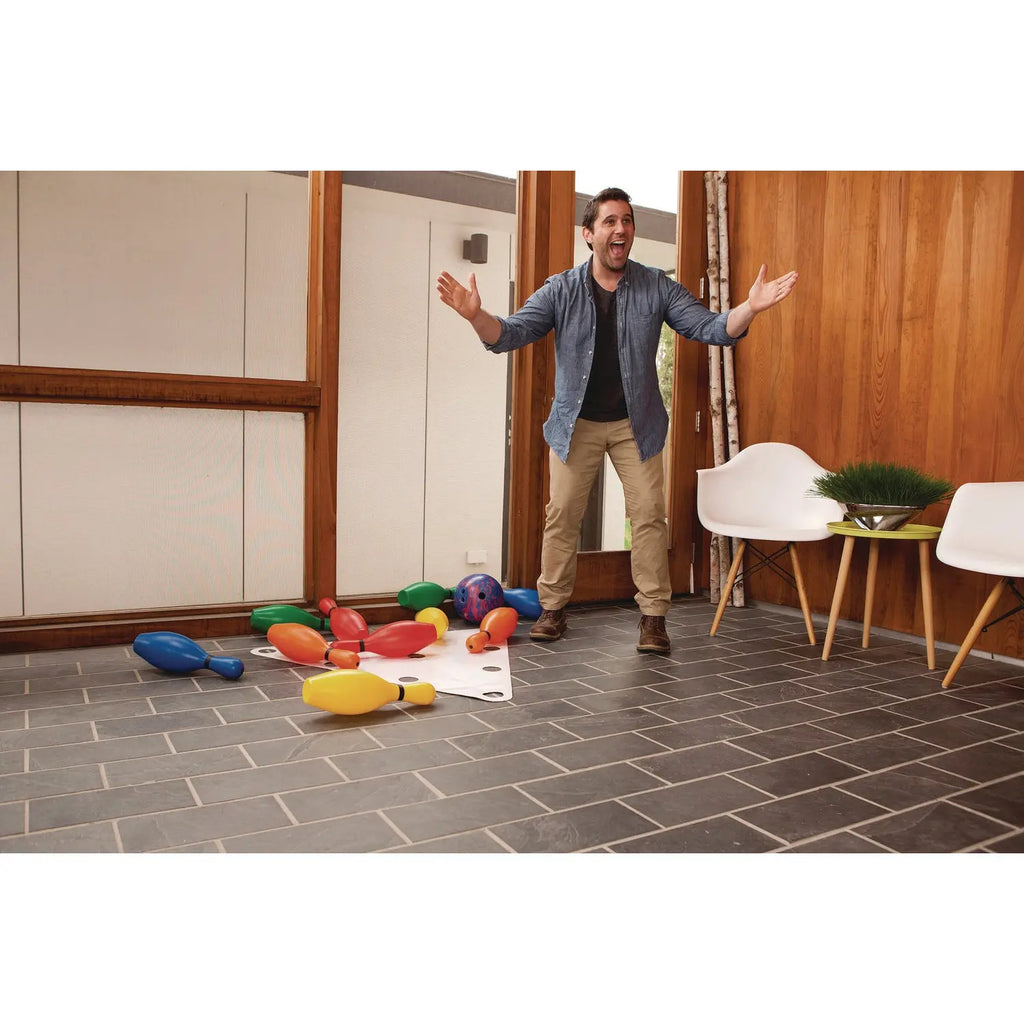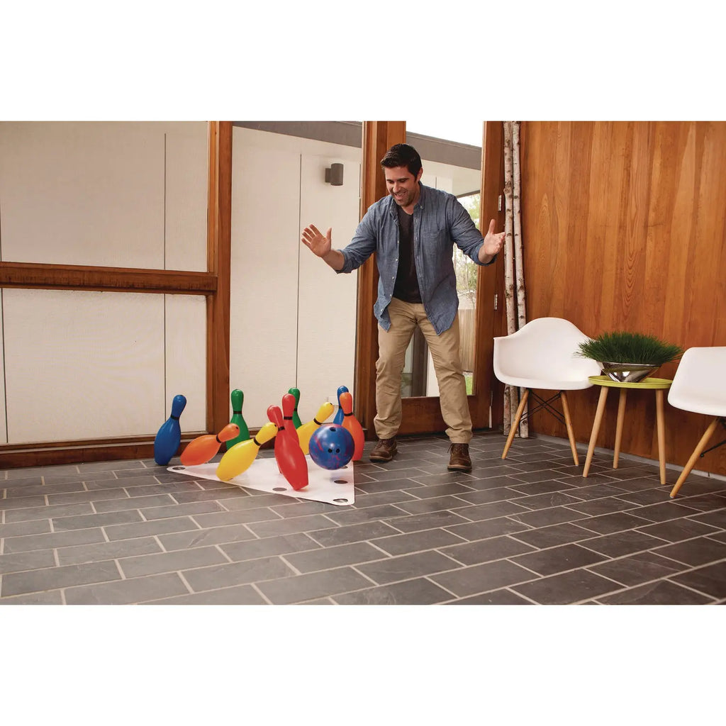 This set is fun for everyone to bowl safely indoors or outdoors. This set includes ten plastic bowling pins, a setup sheet, and a score pad. Fill with sand for added weight.
