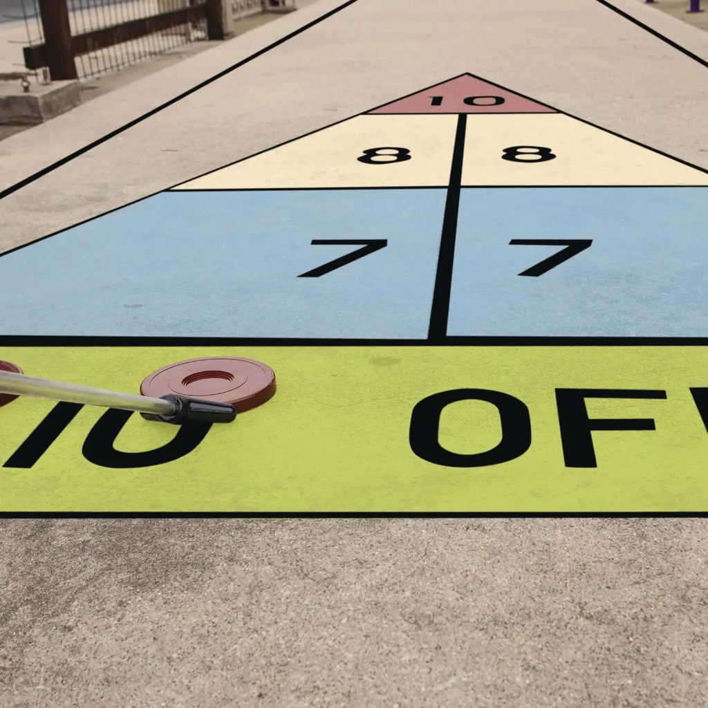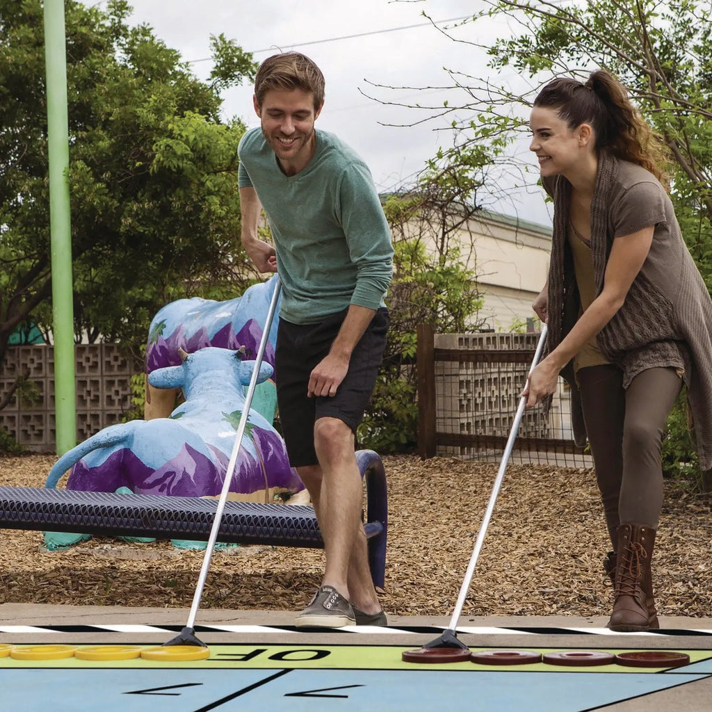 This set comes with everything you need to start a relaxing or competitive game of shuffleboard. Four lightweight and durable aluminum cues can stand up to frequent use, indoors or outdoors. This shuffleboard set also comes with eight plastic discs in two colors to conveniently distinguish teams.