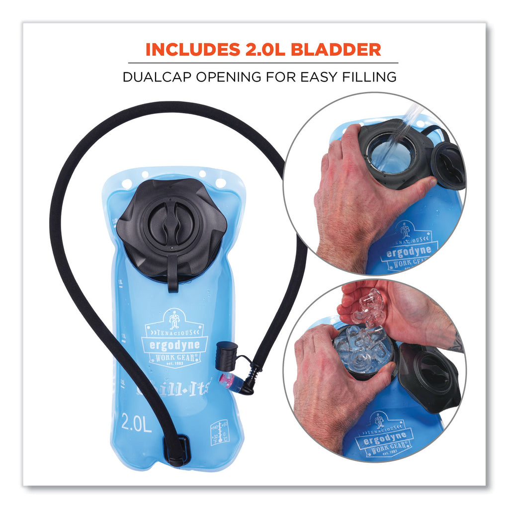 This low profile hydration pack provides convenient on-the-go hydration from workday to weekend. The 2-liter bladder features a wide DualCap for easy no-spill filling with water or ice. Both the pack and tube are insulated to keep water cool in the heat. The antimicrobial bite valve with cover protects against contaminants for clean all-day drinking. The lightweight and low-profile design is comfortable for wear both on and off the worksite. The pack itself is made with durable 600D water-resistant ripstop polyester for protection in rough conditions. A zippered top closure keeps the bladder secure while also preventing dirt and debris from getting into the pack. Breakaway hook-and-loop shoulder straps safely detach to prevent the pack from dangerously snagging. The water bladder can be thoroughly cleaned using the Chill-Its 5159 Hydration Pack Cleaning Kit (sold separately).