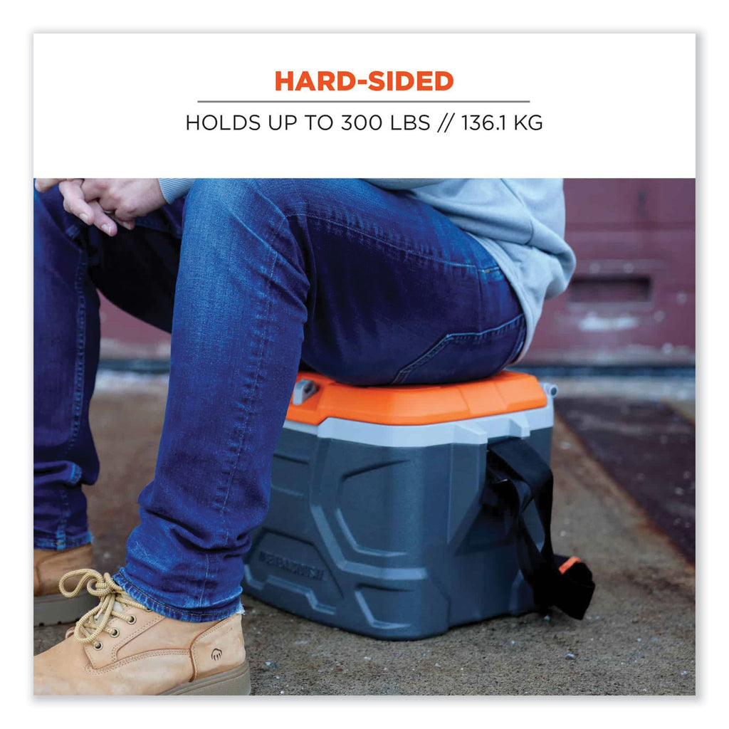 This industrial hard-sided cooler is a durable jobsite cooler that keeps food and drinks cold for up to 30 hours. It features a 17-quart (16.1 L) main compartment, an interior compartment for personal items, an optional lock hasp to accommodate #1 Master Lock (sold separately), and a fabric handle/shoulder strap for carrying. This cooler can hold 18 cans and has a recessed lid to accommodate 1 L bottles. The hinged lid locks in place at 90 degrees or opens a full 180 degrees to access the interior compartment that can hold keys, utensils, napkins and more. The hard-sided, rugged construction cooler can also be used as an extra seat and will support up to 300 lbs. The fabric shoulder strap can be converted to a handle for easy transportation to the jobsite.