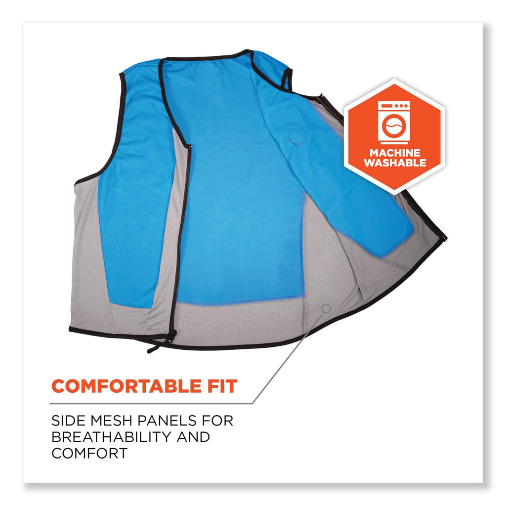 This wet evaporative cooling vest is made with a lightweight PVA material that provides immediate cooling relief to the core area. The lightweight construction is designed with breathable mesh panel siding making it more comfortable than other wet evaporative vests that can be heavy to wear. A front zipper offers an easy on/off, customized fit. For best results, we recommend this body cooling vest be worn over a t-shirt and not covered by other clothing. In order to activate, simply run under water and wring out, no ice or refrigeration is needed. The PVA material is super evaporative and feels cooler than ambient air, keeping you feeling cool and comfortable for hours. Machine wash as needed and hang dry for longest life, the vest will stiffen as it dries. All PVA materials dry stiff, to reactivate and soften, run under water. Great for construction, landscaping, roofing, or anybody working in the heat.