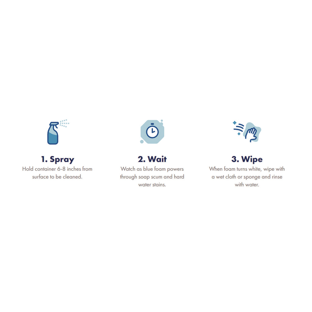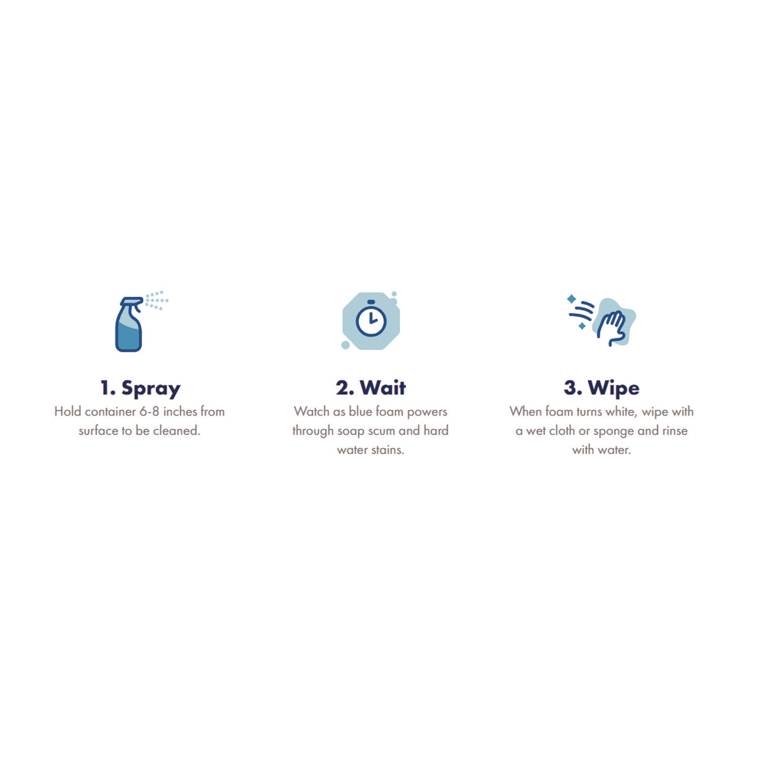 Penetrating foam sprays on blue, turns white when clean. OxiClean Stain Fighters go to work on contact, breaking up soap scum and hard water stains. Just wipe and rinse to reveal a brilliant shine. Non-staining formula contains no CFCs. Use on tubs, glazed ceramic tile, fiberglass, shower doors, vinyl curtains, sinks, countertops and chrome fixtures.