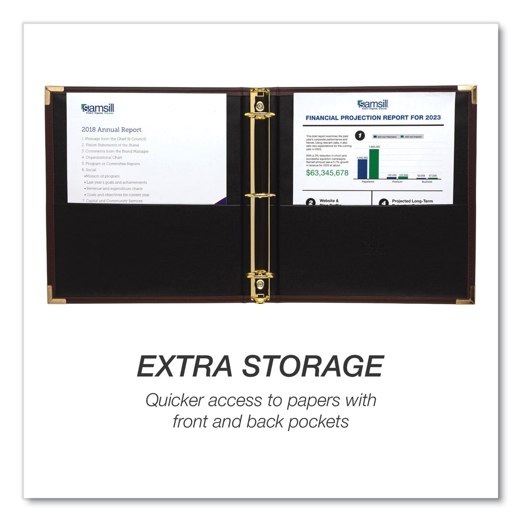- Rigid, leather-like cover with hand-stitched edges and brass-plated metal rings and corners give a clean, professional, upscale appearance.