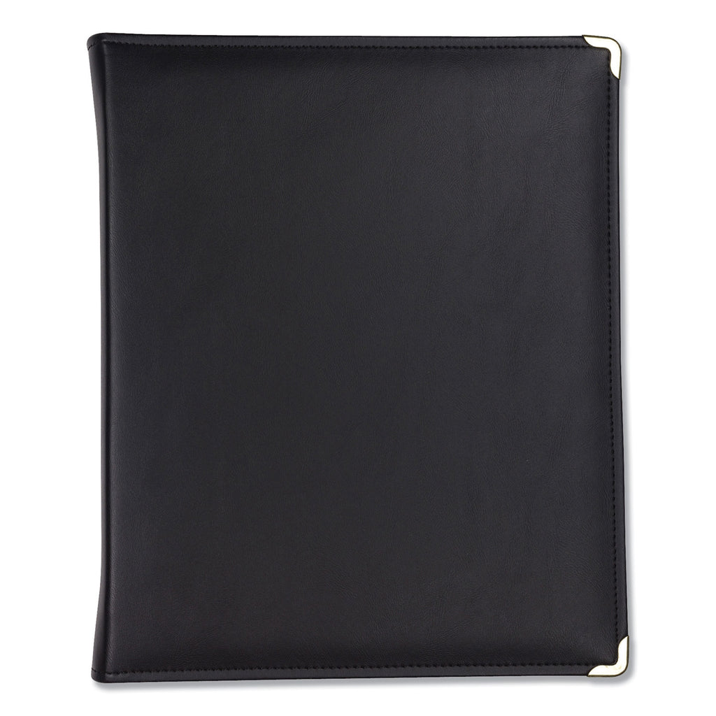This 3-ring binder with rich-looking leather-like material is designed to meet your professional needs. It includes a curved spine, concealed rivet construction, and two interior pockets for storing and organizing your important documents. The luxurious texture of the leather-like exterior is complemented by sewed edges for an extra touch of elegance.
