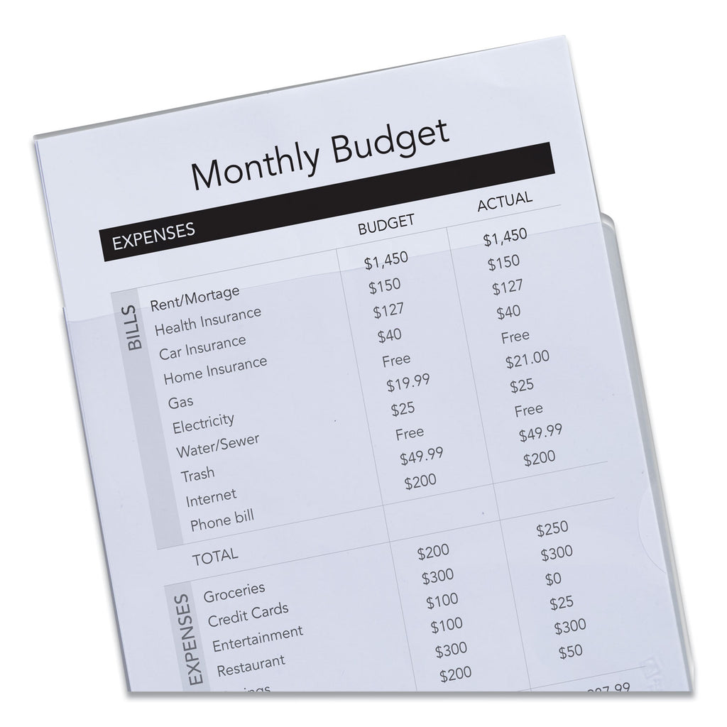Reusable lightweight sleeves are perfect for active projects and organizing office space. Transparent folder allows you to view contents easily. Sealed on two sides to hold items securely. Non-stick, polypropylene material won't lift print. Sleeves hold up to 20 sheets of 8.5 x 11 paper.